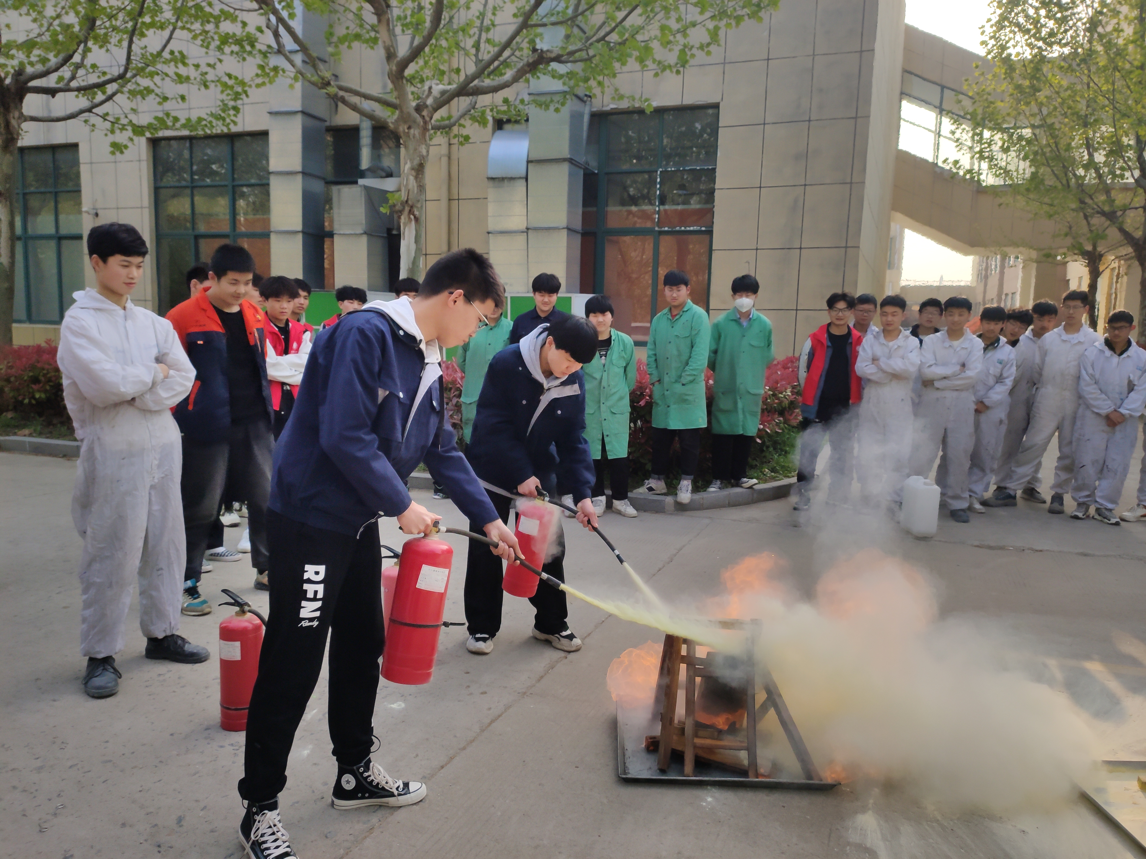 负责老师强调了汽车实训基地存在的火灾隐患,介绍了火灾的分类、成因、特性以及学院消防安全常识,讲解了实训基地灭火器材的用途、性能以及灭火器的使方法,并进行操作演示。最后,学生们使用灭火器进行灭火演习,学会灭火器的正确使用方法。