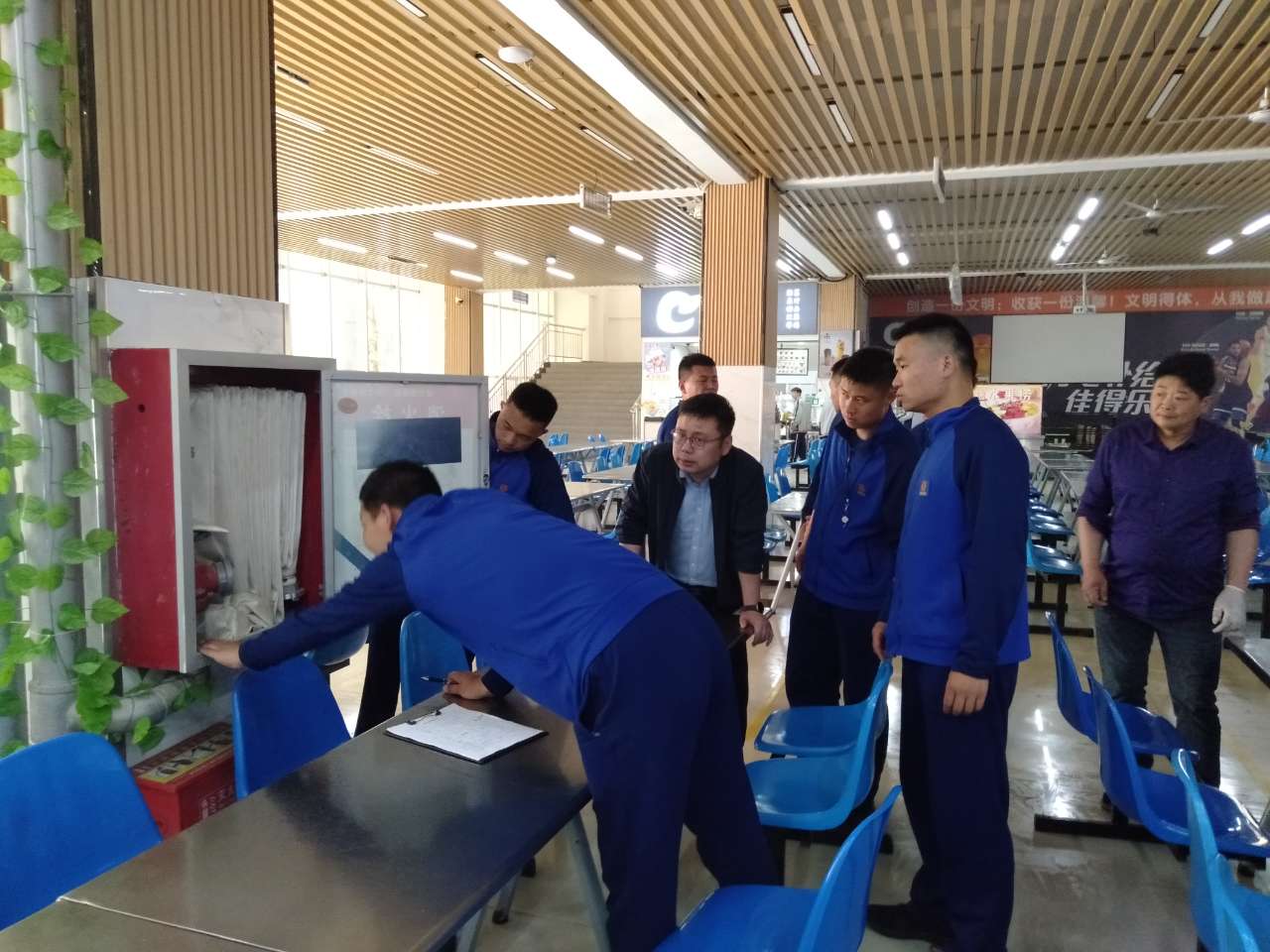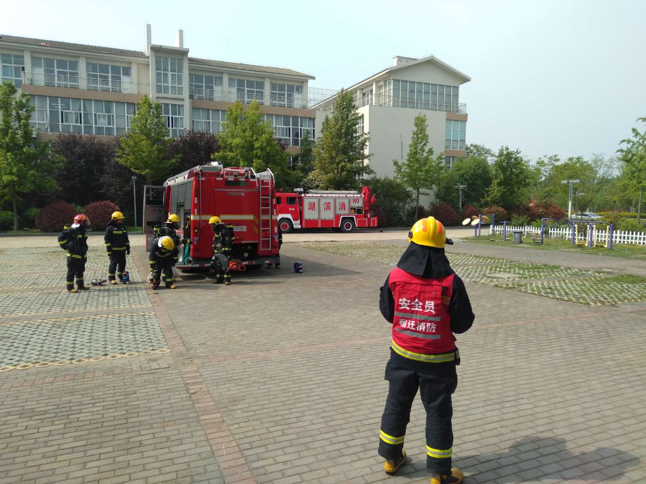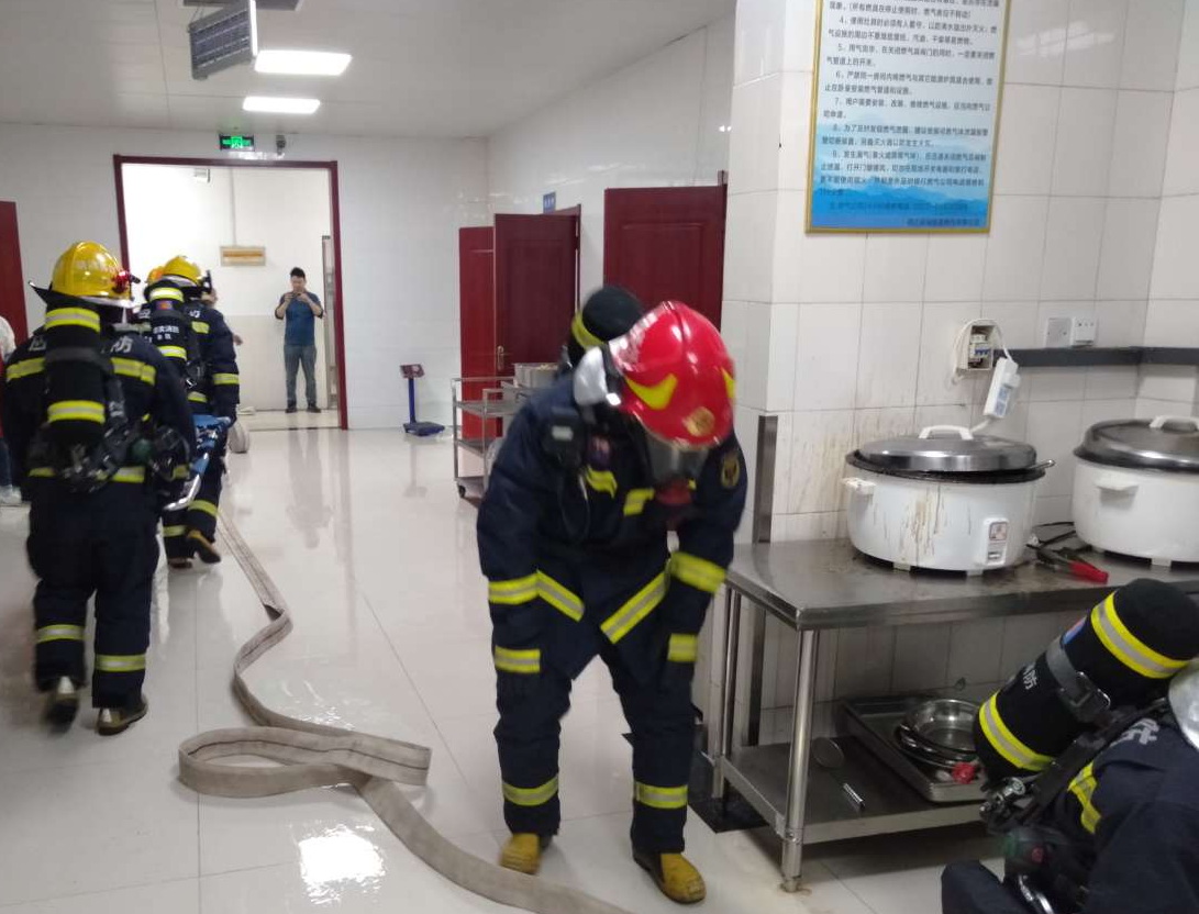 灾情假设食堂厨房发生火灾,火势蔓延并有人员被困。湖滨新区消防救援大队第一时间出动3车16人赶赴现场处置。救援人员抵达现场后,现场展开部署、现场攻坚,迅速完成火情扑灭和人员解救。演练结束后,消防人员对校区的固定消防设施、消防水源、重点部位等相关情况实地查看,并提出了整改意见。