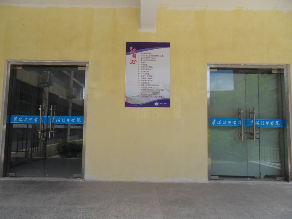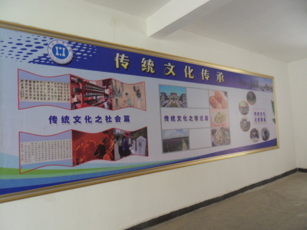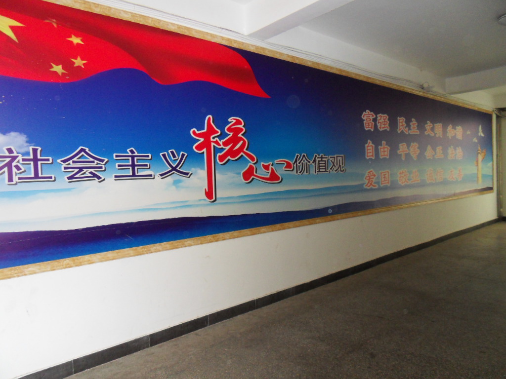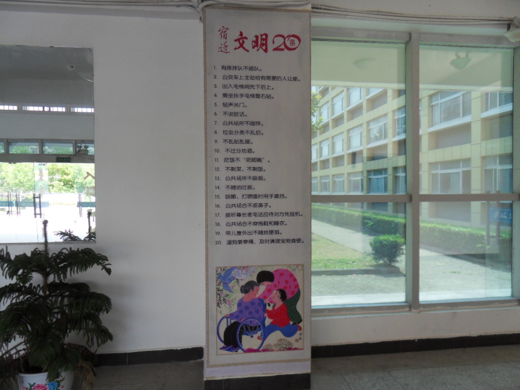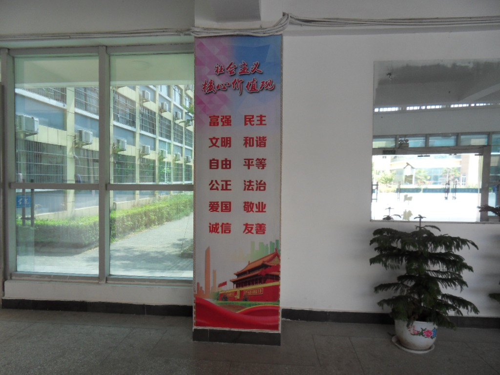 按照要求,安保处在男生宿舍门口玻璃镜两边分别悬挂内容为《社会主义核心价值观》和《宿迁文明20条》;二号宿舍西通道西面墙增加淮海技师学院宿舍考核表、值班制度牌和值班表张贴栏;三号宿舍西通道西面墙增加梅兰竹菊四幅图片。同时,二号宿舍东通道东面墙增加《传统文化传承》宣传图片,内容包括传统文化之社会篇、传统文化之宿迁篇、传统文化之校园篇三个篇章;三号宿舍东通道东面墙增加《弘扬民族精神》宣传图片,内容包括自强不息、奋发有为、团结一致、勤劳勇敢、爱好和平、爱国主义等六幅图片。