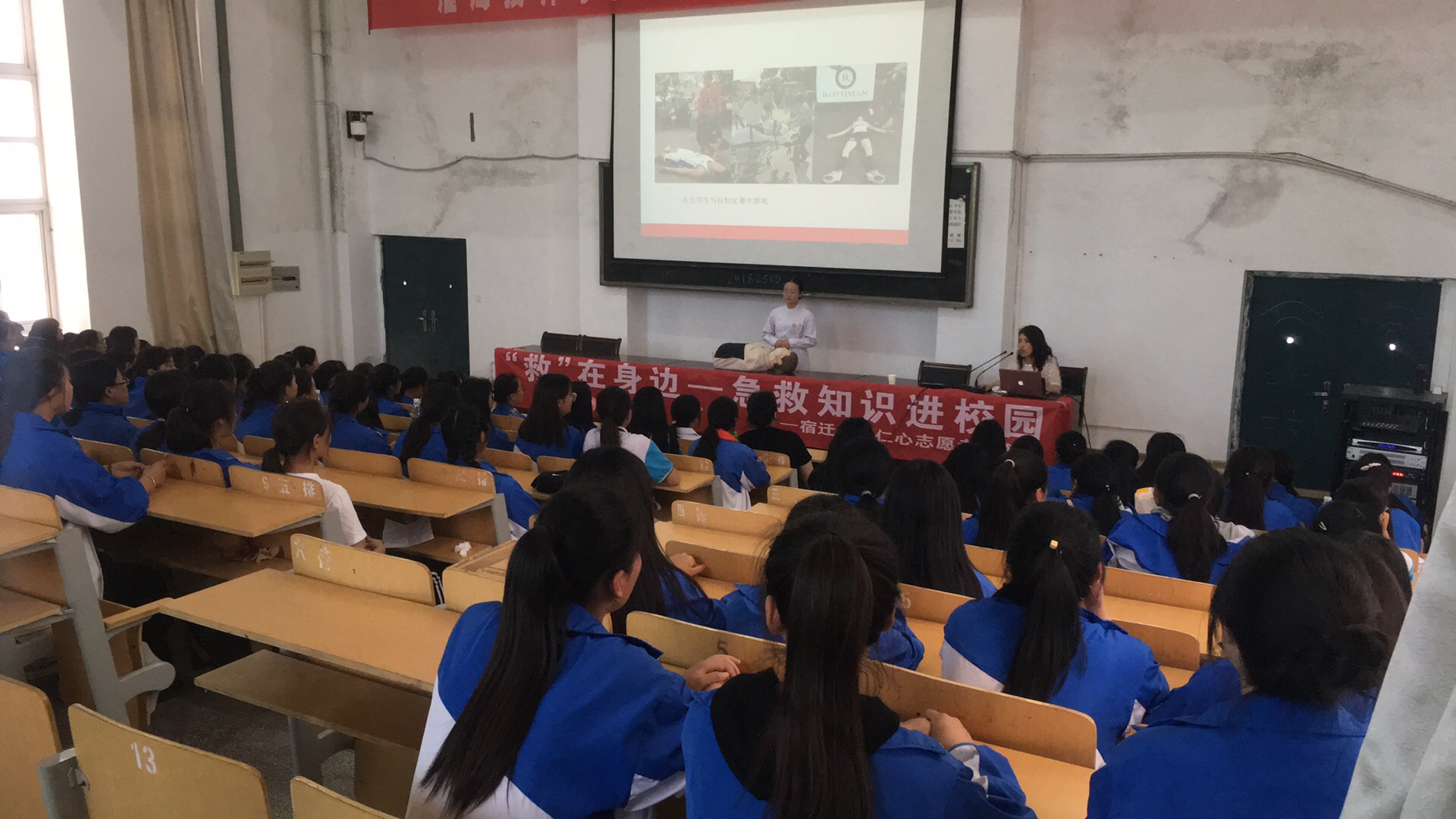 “救”在身边——急救知识进校园项目,是由宿迁卫校仁心志愿者服务队组织开展,旨在通过项目活动提高青年学生现场急救知识、急救意识和急救技能水平,着重提高青年学生急救理念。主讲人首先让同学们了解了心肺复苏(CPR)的历史意义,然后讲解了它的基本操作步骤,最后还为同学们演示了伤口的包扎及病人的搬运。尤其在讲解心肺复苏操作步骤时,重点讲解了心脏骤停一旦发生,如果得不到及时的抢救复苏,4-6分钟后会造成患者脑和其他重要器官组织的不可逆损害,因此,心脏骤停后的心肺复苏必须现场立即进行,为进一步的抢救直至挽回心脏骤停伤病员的生命赢得最宝贵的时间。主讲老师还对胸外按压的部位、频率、深度和气道开放消除异物的方法以及人工呼吸的要点进行了详细讲解。随后,在老师的指导下,同学们分组在急救模型上进行现场操作培训。