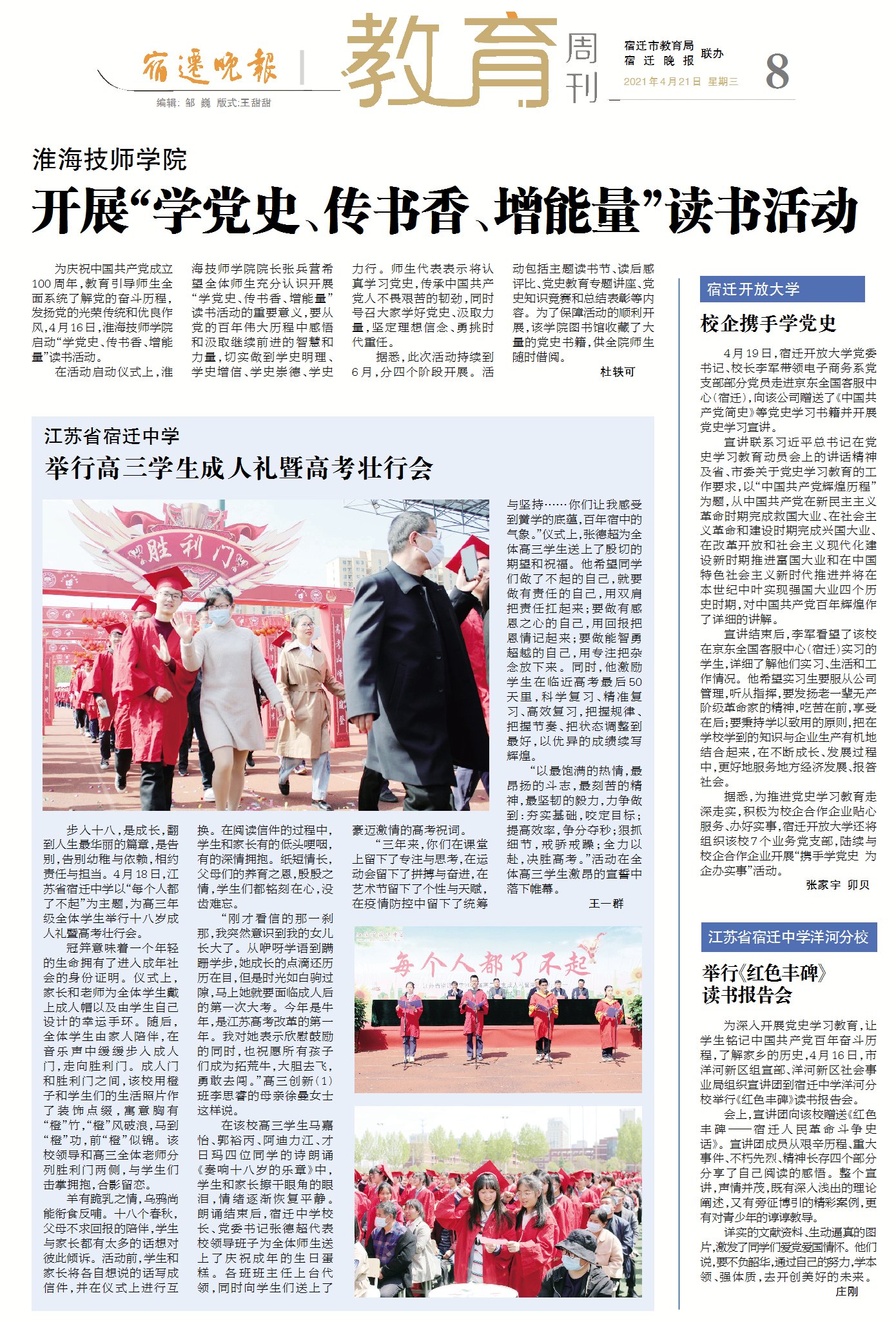 宿迁晚报:淮海技师学院开展“学党史、传书香、增能量”读书活动