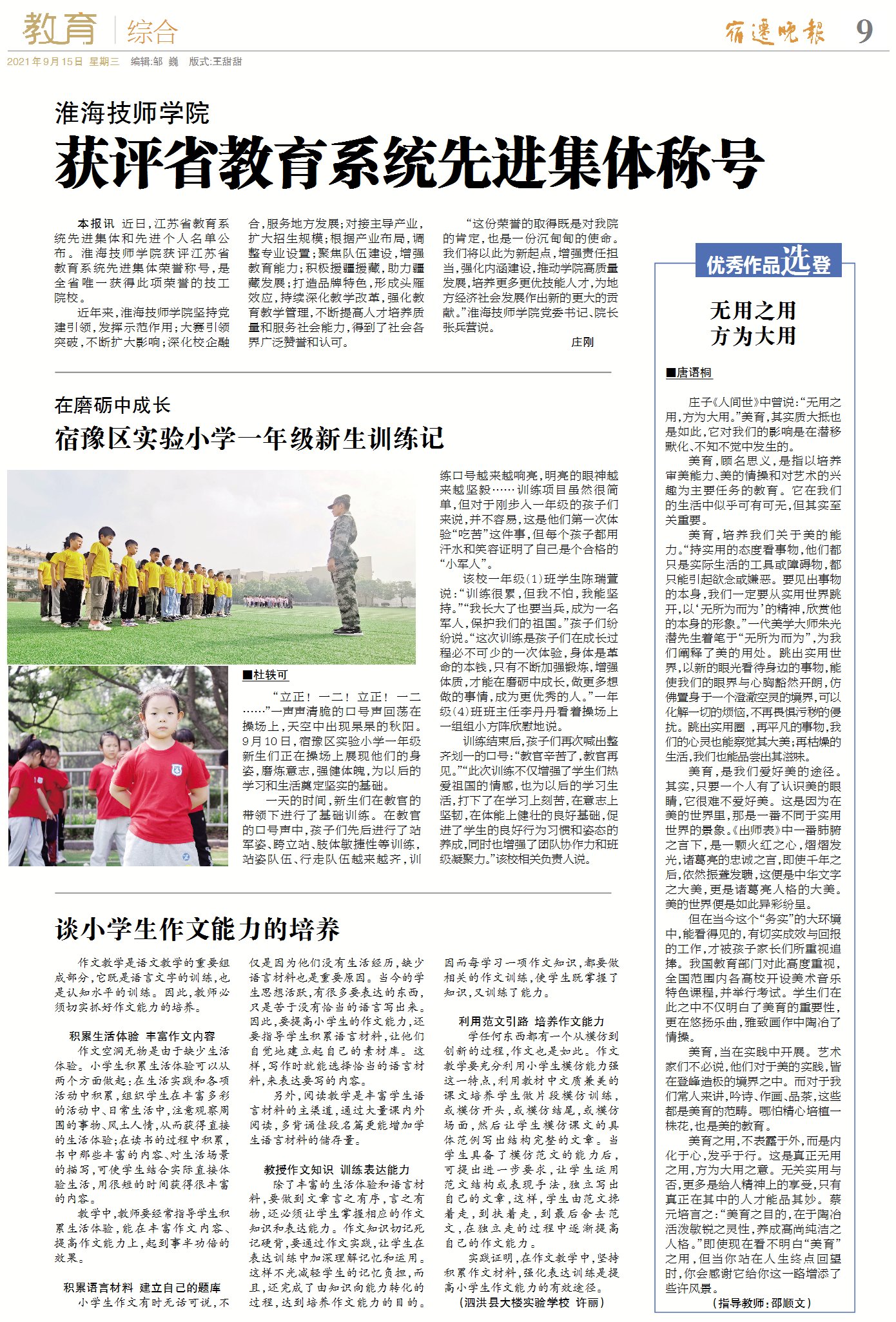宿迁晚报:淮海技师学院获评省教育系统先进集体称号