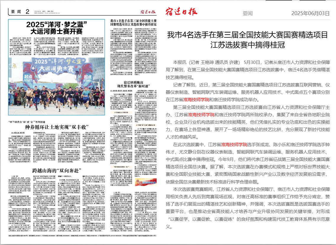宿迁日报:我市4名选手在第三届全国技能大赛国赛精选项目江苏选拔赛中摘得桂冠