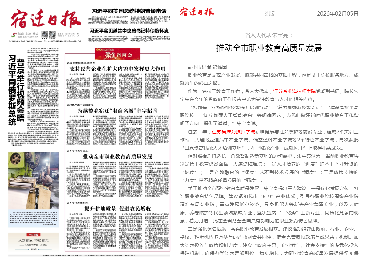 宿迁日报:省人大代表朱宇亮:推动全市职业教育高质量发展