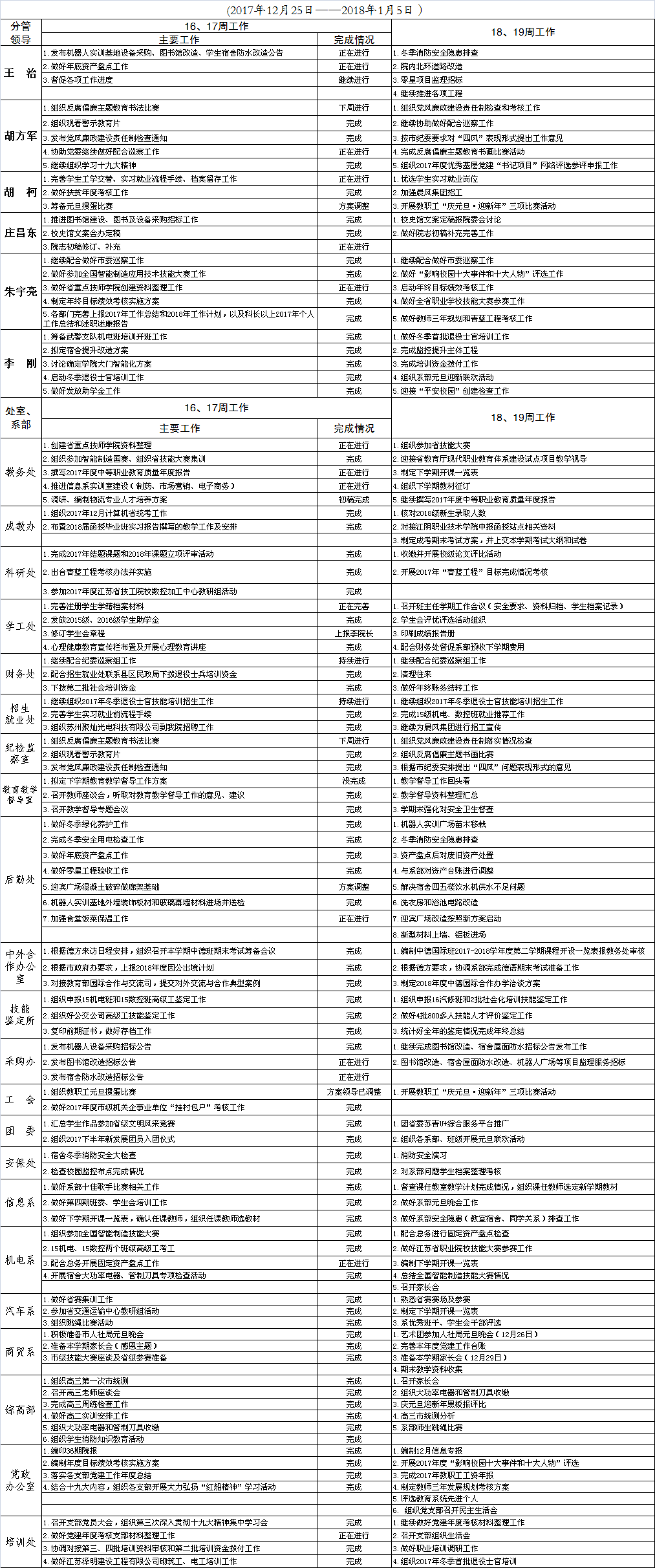 2017-2018学年度第一学期第16、17周重点工作安排表