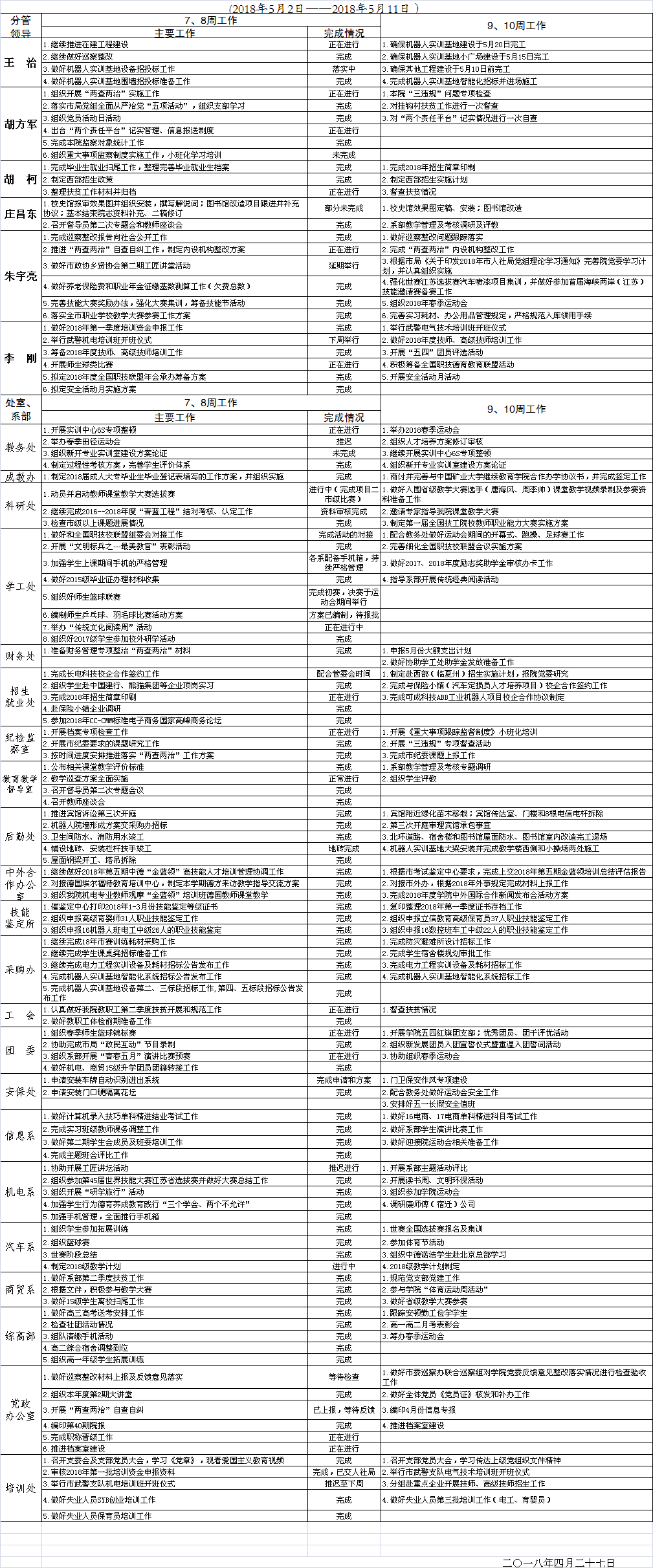 2017-2018学年度第二学期第7、8周重点工作安排表