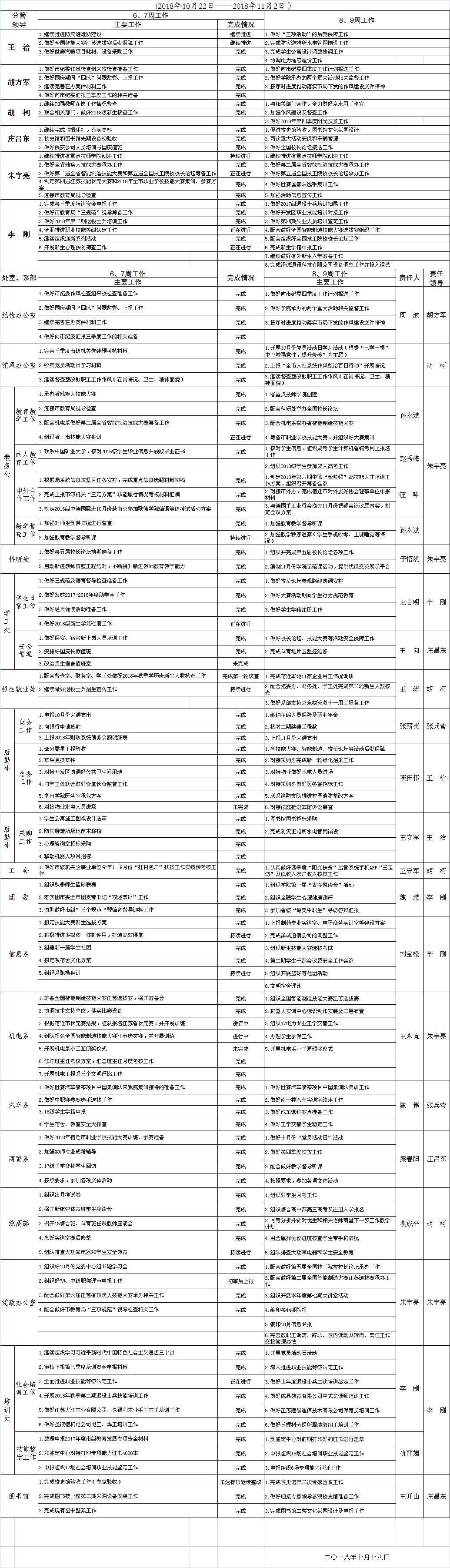 2018-2019学年度第一学期第6、7周重点工作安排表