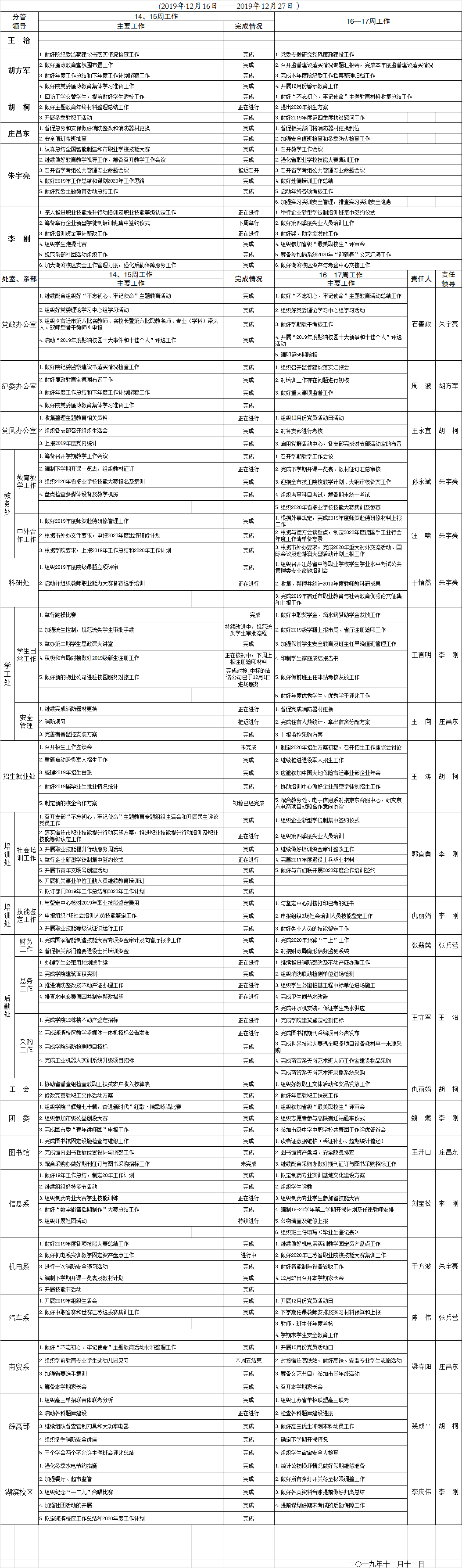 2019-2020学年度第一学期第16—17周重点工作安排表
