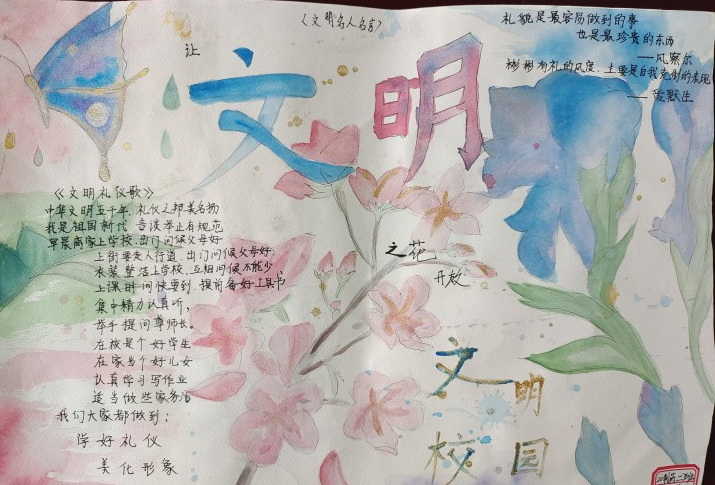 艺术是美的表现,也是思想的体现。在本次比赛中,各班级学生踊跃报名、积极参赛,以书法、绘画的形式抒发他们对淮海校园风景人情的赞美,以及对淮海校园文化的热爱。有的同学以校园卫生的文明,绘画出了红绿相称、干净整洁的运动场地;有的同学以提升自我修养为文明,篆写出了遒劲有力、字正方圆的书法作品;有的同学以淮海的春天为模板,渲染了一幅祥和、文明的校园生活……同学们认真寻找校园美丽的风景人情,用参赛作品表达自己对校园美好生活的赞美和热爱。