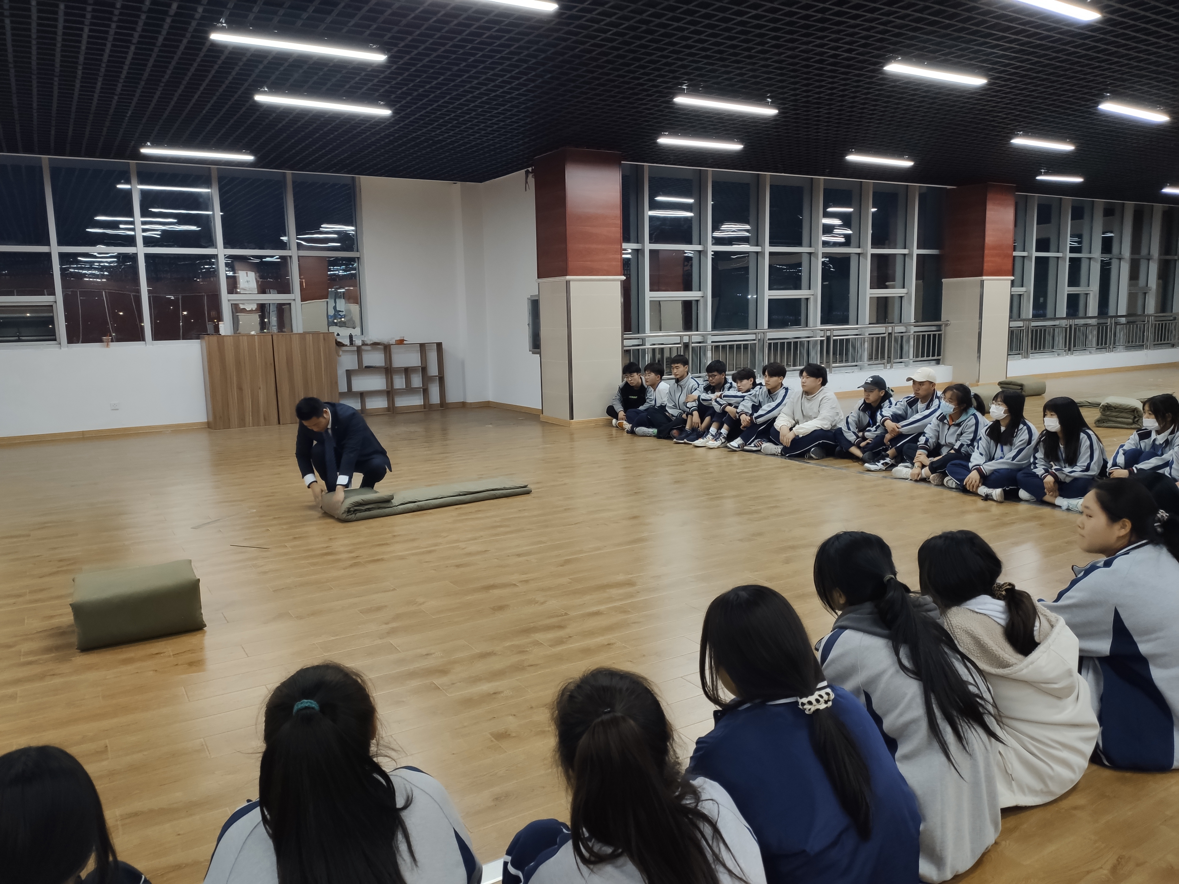 武春雷拿出一床军被在空地上摆放好,同学们围绕着他坐成一圈。他仔细指导叠军被的每一步——压、量、切、塞、抠,先把被子一折三,然后在被子一头的2/3处用手指做个标记,再把这个地方折叠的凸起来,另一头也这样折,最后在中间也折叠凸起一块后对折,就这样一条被子变成了有棱有角的“豆腐干”了。同学们听得非常认真,随后自己动手,仔细回想着每一个步骤,做的像模像样。武春雷来到每一个同学面前,仔细查验,有不足的地方及时指出。最后,同学们都做的非常棒,叠出了完美的“豆腐块”。