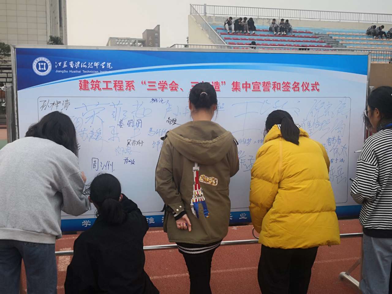 为全面贯彻学院“三学会、三打造”主题教育系列活动要求,培养学生良好行为习惯,打造文明校园、和谐校园,11月10日,建筑工程系在田径运动场举行“三学会、三打造”集中宣誓和签名活动。
