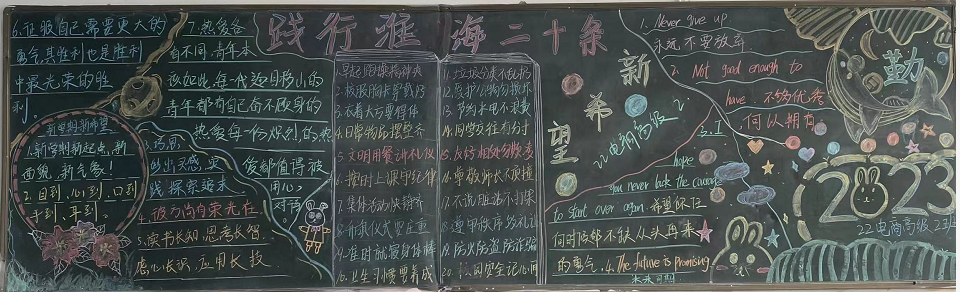 在评比活动中,各班踊跃参与,积极寻找相关素材,在黑板报上以丰富多彩、喜闻乐见的形式深入宣传“淮海文明20条”文明新风尚,并配以情感丰满的文字,全面体现了学生的文明意识。系部组织评委从版面结构、板报内容、粉笔字等方面对各班黑板报进行了量化评比,最终22电商2班荣获一等奖,22电商4班荣获二等奖,21物流班荣获三等奖。
