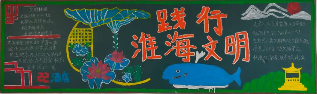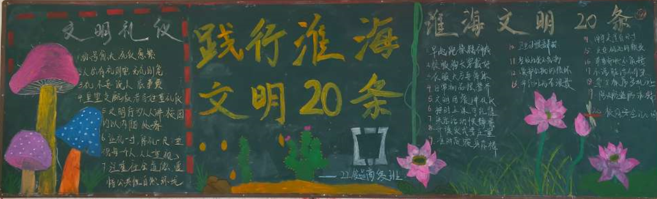 通过这次黑板报评比活动,让同学们对“淮海文明20条”有了更深刻的理解,营造了文明礼仪的良好氛围,塑造和展现了文明向上的良好形象,为营造和谐文明校园起到了积极地促进作用。