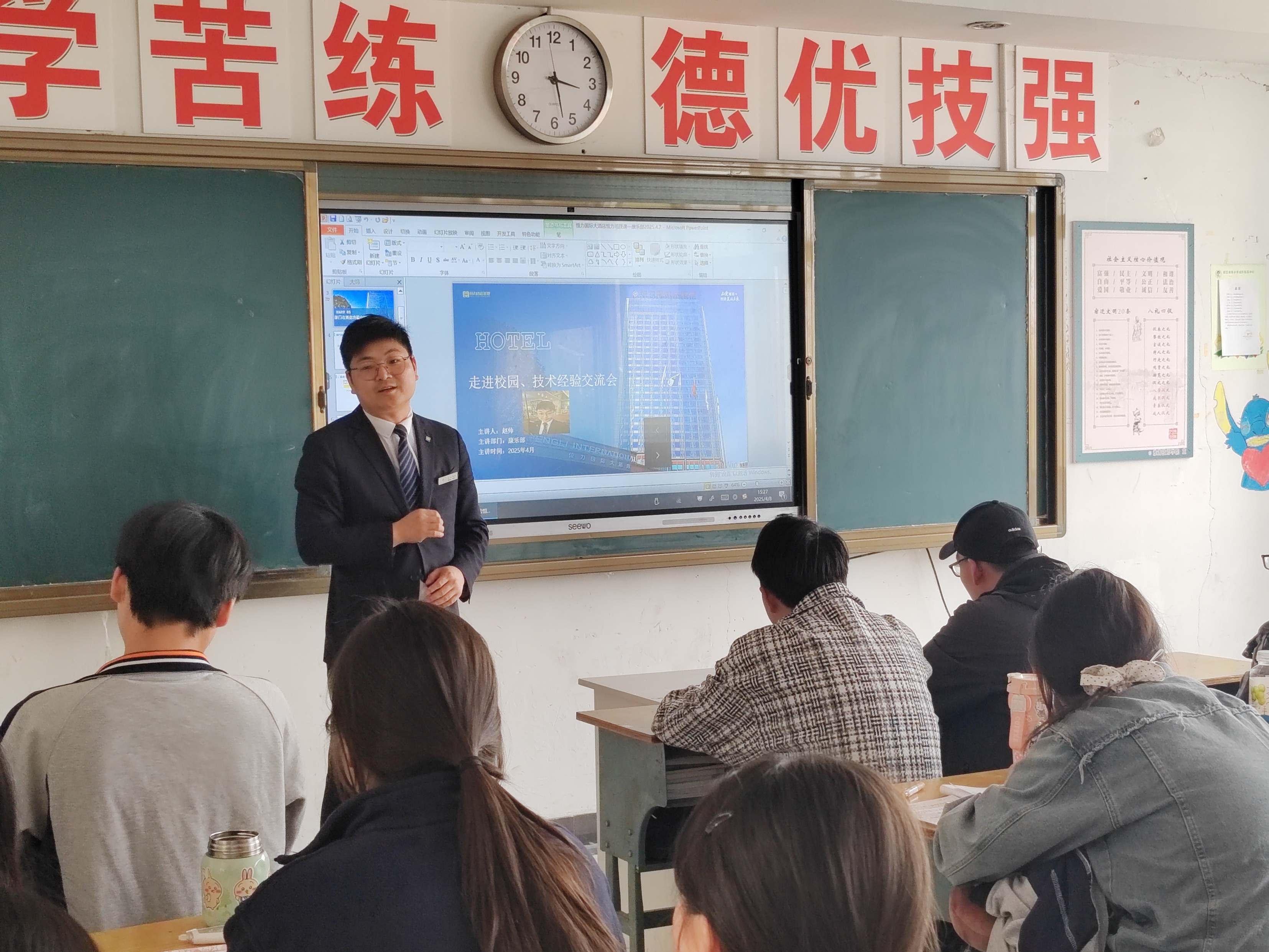 2025年4月8日,现代服务系举办“走进校园、技术经验交流会”专题讲座,特邀宿迁恒力酒店康乐部经理赵帅担任主讲嘉宾,全体酒店专业学生参加。
