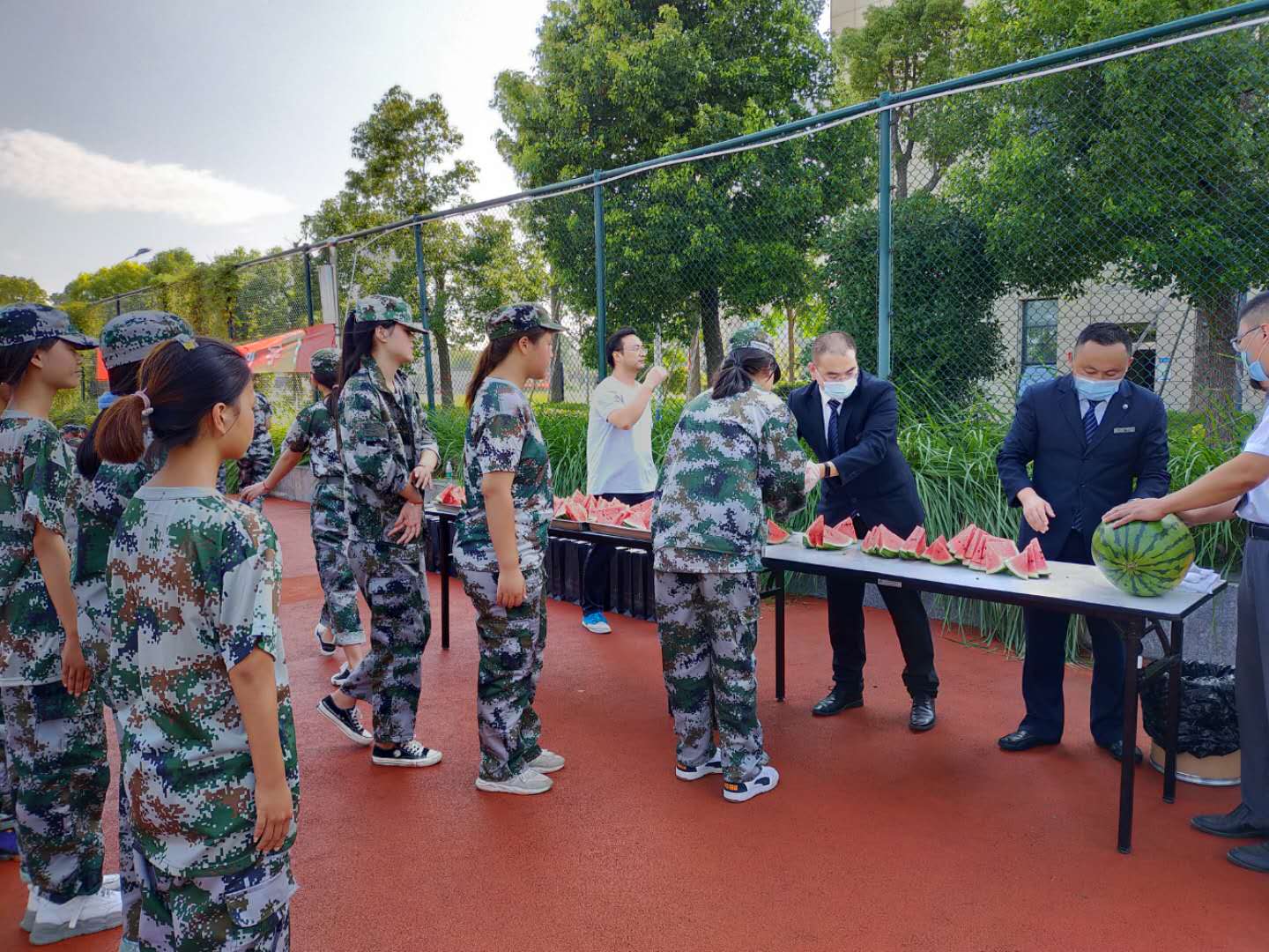 李明锋为同学们带来了解暑的西瓜和生活用品,希望大家在学院期间认真学习理论知识,有时间到企业实践锻炼,同时要求同学们树立远大理想。