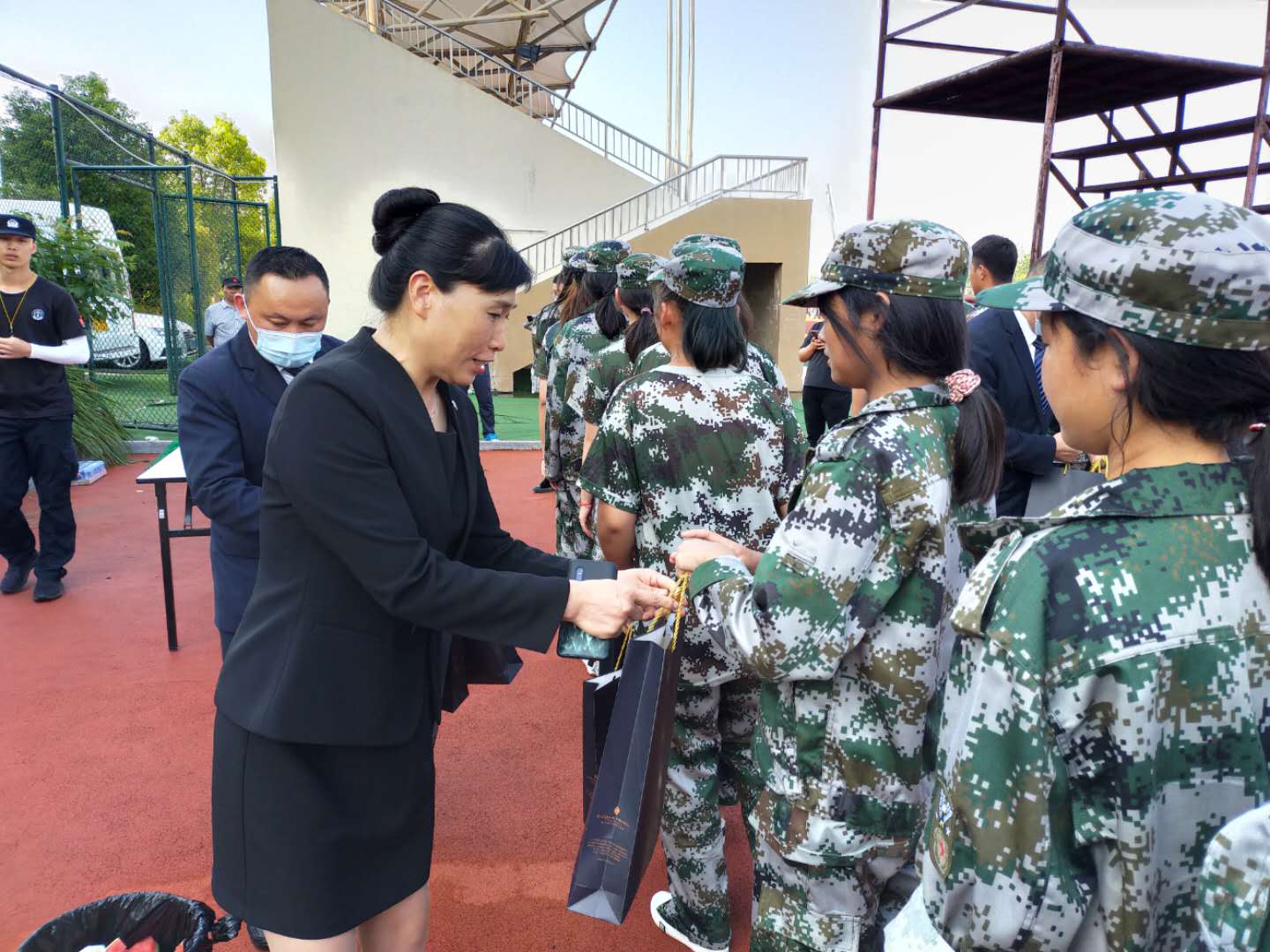 9月2日下午,宿迁恒力国际大酒店总经理李明锋带领企业相关人员一行,到我院看望正在军训的冠名班学生并送上慰问品。