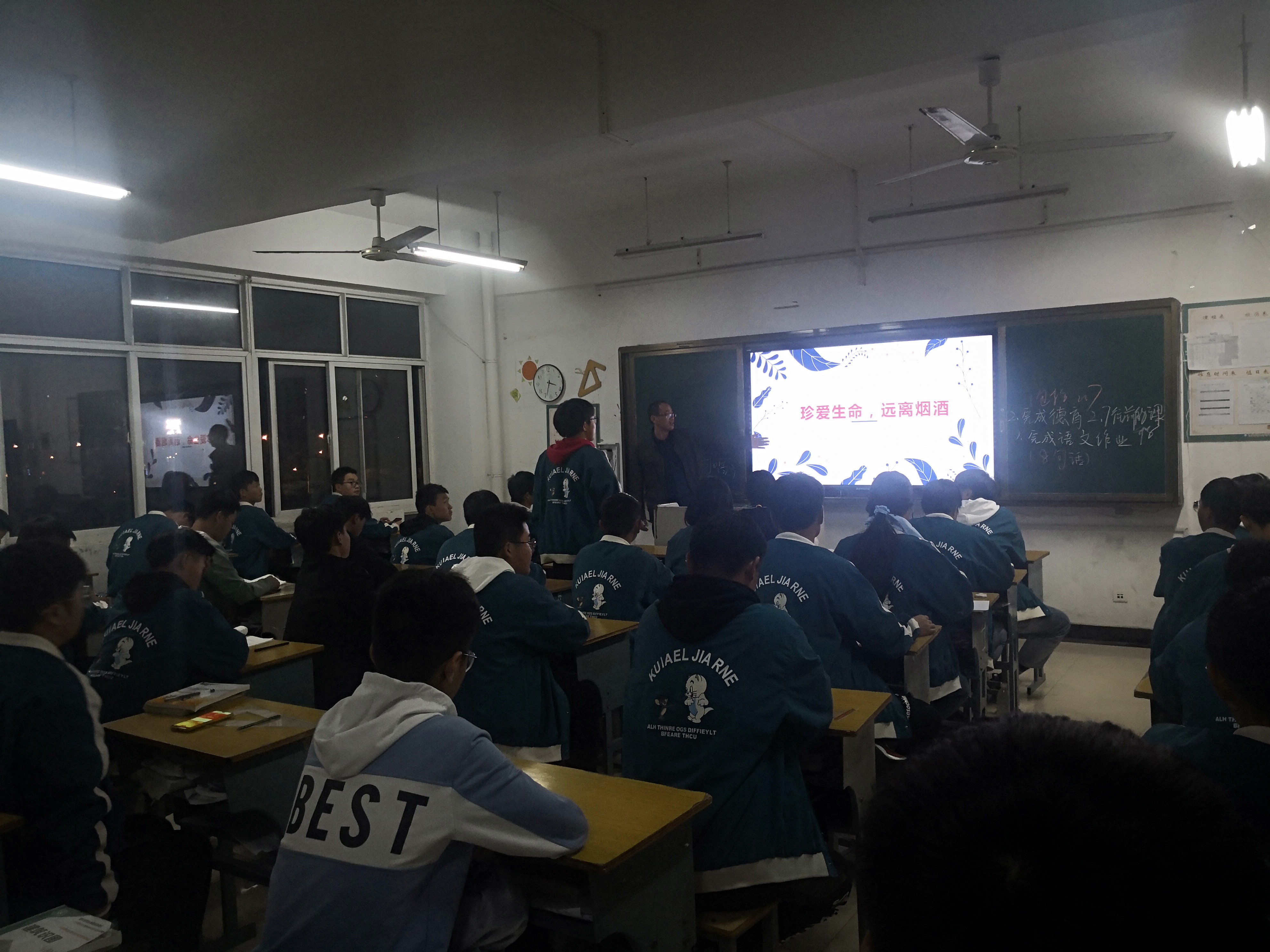 在班会上,各班班主任首先介绍了烟和酒,让学生们了解烟、酒及其成分。然后从青少年心理特点层面上,向学生们详细阐述了吸烟饮酒的危害。学生们通过讨论、开放式发言等形式,说出自身身边的真实案例,加深对吸烟饮酒造成的恶劣影响的感受。最后通过班主任的总结,学生们进行自评、他评。