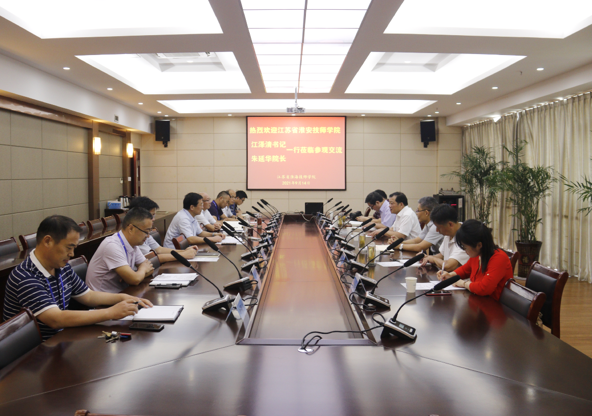 9月14日,江苏省淮安技师学院党委书记江泽清,党委副书记、院长朱延华,党委副书记曹国平,党委委员、副院长姜亚群等一行7人到我院参观交流。学院党委书记、院长张兵营,党委副书记徐守军,党委委员、纪委书记胡方军、副院长朱宇亮、副院长李刚及相关部门负责人参加座谈交流。