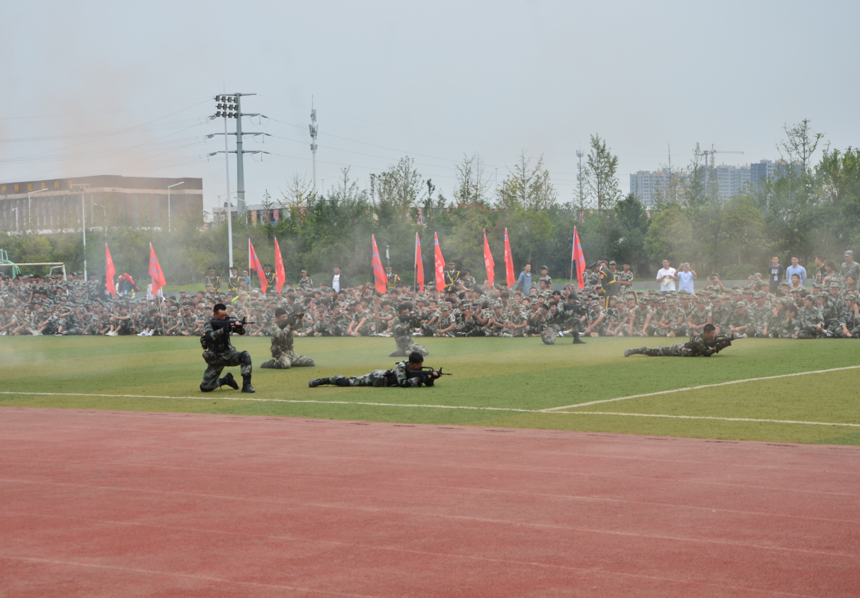 期间,各系部军训方队代表首先进行了汇操表演,展示了军训学生昂扬的斗志和严整的军容。各个代表队先后入场,在教官的口令下,同学们迈着整齐的步伐,喊着响亮的口号,依次在主席台前展示训练成果,先后进行了稍息、立正、四面转、齐步走、跑步走等科目表演。同学们以饱满的精神面貌,矫健有力的步伐,整齐如一的动作,展示了团队的风采,表现出淮海学子昂扬向上的精神风貌和文明守纪的优良作风。9名军训教官为同学们作了队列展示和战术分队科目表演,威武霸气的身姿和整齐如一的动作赢得了全体师生的喝彩和掌声。
