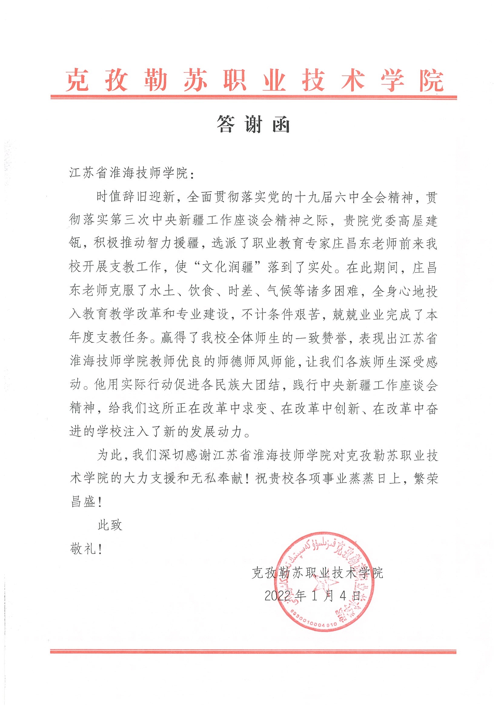 信函中这样写道:“时值辞旧迎新,全面贯彻落实党的十九届六中全会精神,贯彻落实第三次中央新疆工作座谈会精神之际,贵院党委高屋建瓴,积极推动智力援疆,选派了职业教育专家庄昌东老师前来我校开展支教工作,使“文化润疆”落到了实处。在此期间,庄昌东老师克服了水土、饮食、时差、气候等诸多困难,全身心地投入教育教学改革和专业建设,不计条件艰苦,兢兢业业完成了本年度支教任务。赢得了我校全体师生的一致赞誉,表现出江苏省淮海技师学院教师优良的师德师风师能,让我们各族师生深受感动。他用实际行动促进各民族大团结,践行中央新疆工作座谈会精神,给我们这所正在改革中求变、在改革中创新、在改革中奋进的学校注入了新的发展动力。”