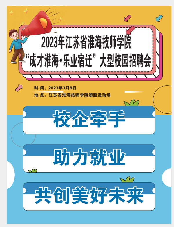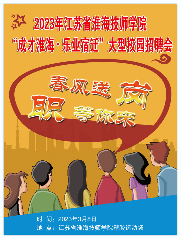 春风送温暖,就业送真情。3月8日,“成才淮海 乐业宿迁”大型校园招聘会将在我院塑胶运动场隆重举行!