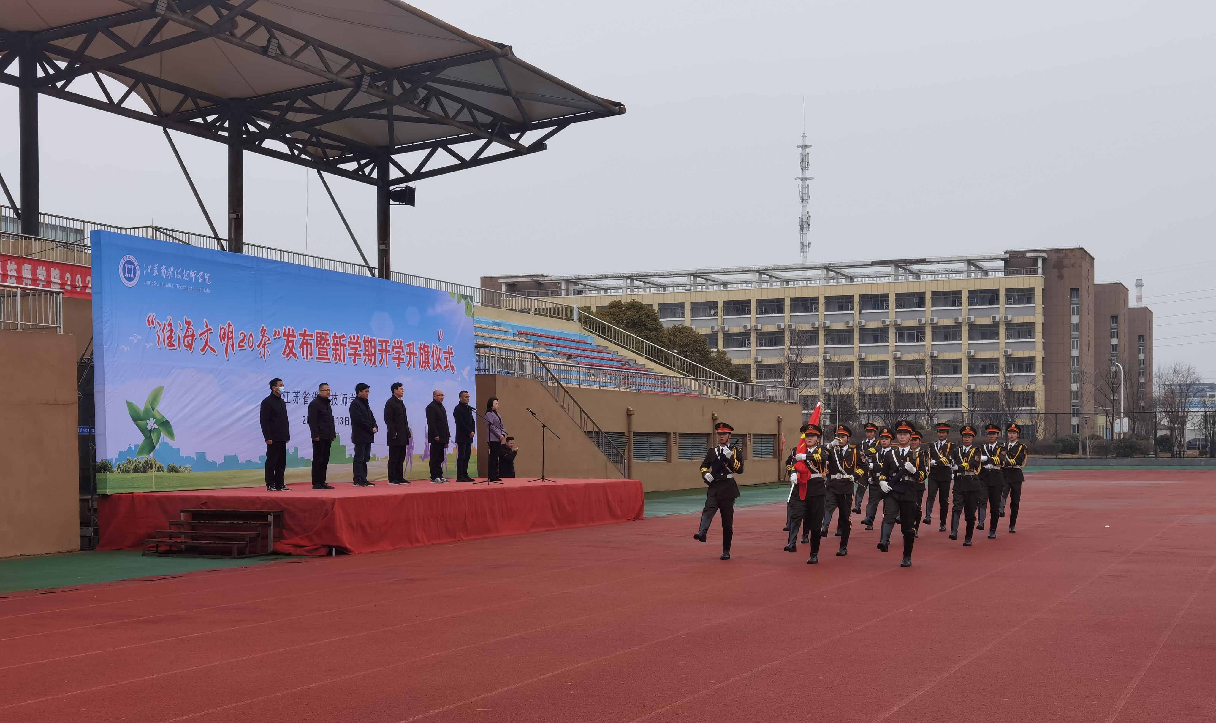 为加强校园文明建设、助力师生文明习惯养成,学院开展“淮海文明20条”征集评选活动。2月13日上午9点30分,学院举行“淮海文明20条”发布暨新学期开学升旗仪式活动,活动仪式上,学校正式发布了“淮海文明20条”,内容涵盖了加强学生身体锻炼、文明礼仪、言谈举止、安全提醒等多个方面内容。学生们纷纷举拳宣誓,将按照相关文明公约,严格自律,文明守纪。