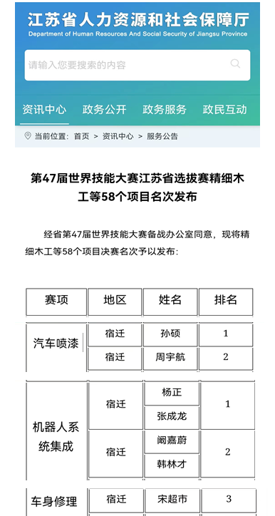 近日,第47届世界技能大赛江苏选拔赛成绩公布,我院选手交出了一份亮眼成绩单:孙硕、周宇航获得汽车喷漆项目第一、二名,杨正、张成龙和阚嘉蔚、韩林才获得机器人系统集成项目第一、二名,宋超市获得车身修理项目第三名,孙硕、杨正、张成龙将代表江苏省参加中华人民共和国第二届职业技能大赛。这是学院继省状元赛取得“状元”突破后的又一优异成绩。