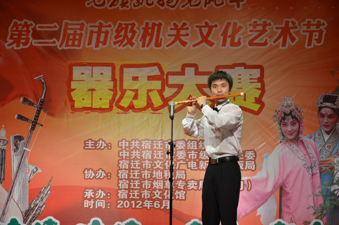2012年6月12日下午,宿迁市第二届市级机关文化艺术节“和风鸣奏润宿迁”器乐大赛在市文化艺术中心多功能厅隆重举行。我院林雨老师代表市人社局参加了此次比赛,经过激烈角逐,林雨老师以一支具有特色的《牧民新歌》,一举夺魁,获得本次器乐大赛第一名的好成绩。