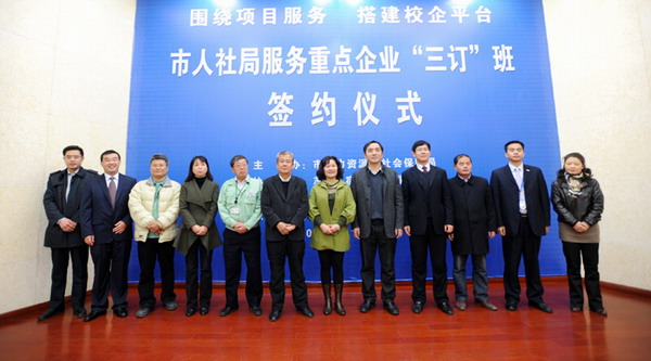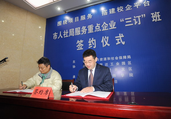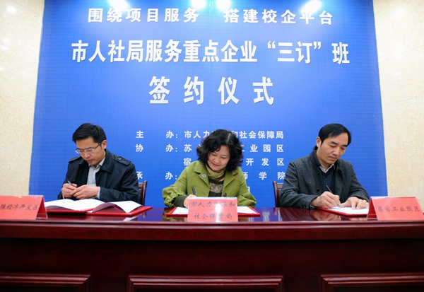 11月22号上午,市人社局服务重点企业“三订”班签约仪式在我院举行。市人社局局长张莉、苏宿工业园区、宿豫经济开发区负责同志,可成科技、尼吉康电子、长电科技、江苏精科、江苏秀强、京东商城等本地知名的企业负责人参加仪式。我院领导班子全体成员及相关专业定制班学生参加了仪式。仪式由市人社局纪检组长李军主持。