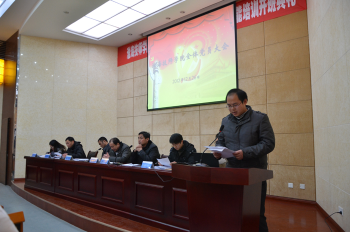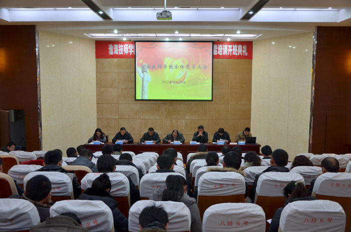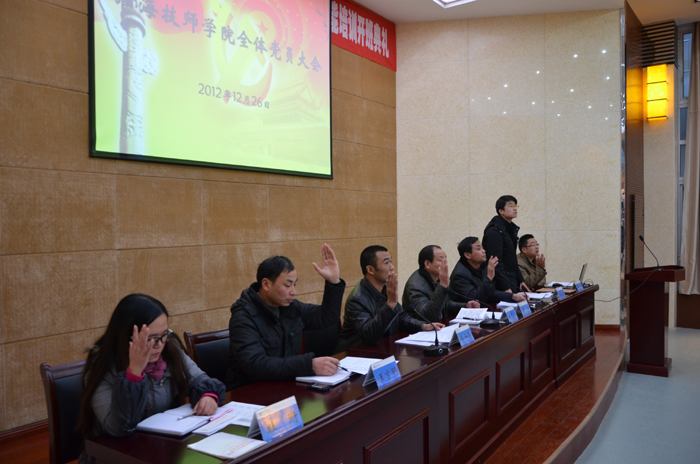 为深入推进“贯彻党的十八大精神”活动深入开展,12月26日下午,学院在第二阶梯教室召开全体党员大会,党总支书记姚嵩山、各支委以及全体党员、预备党员、入党积子参加会议,会议由组织委员胡柯同志主持。