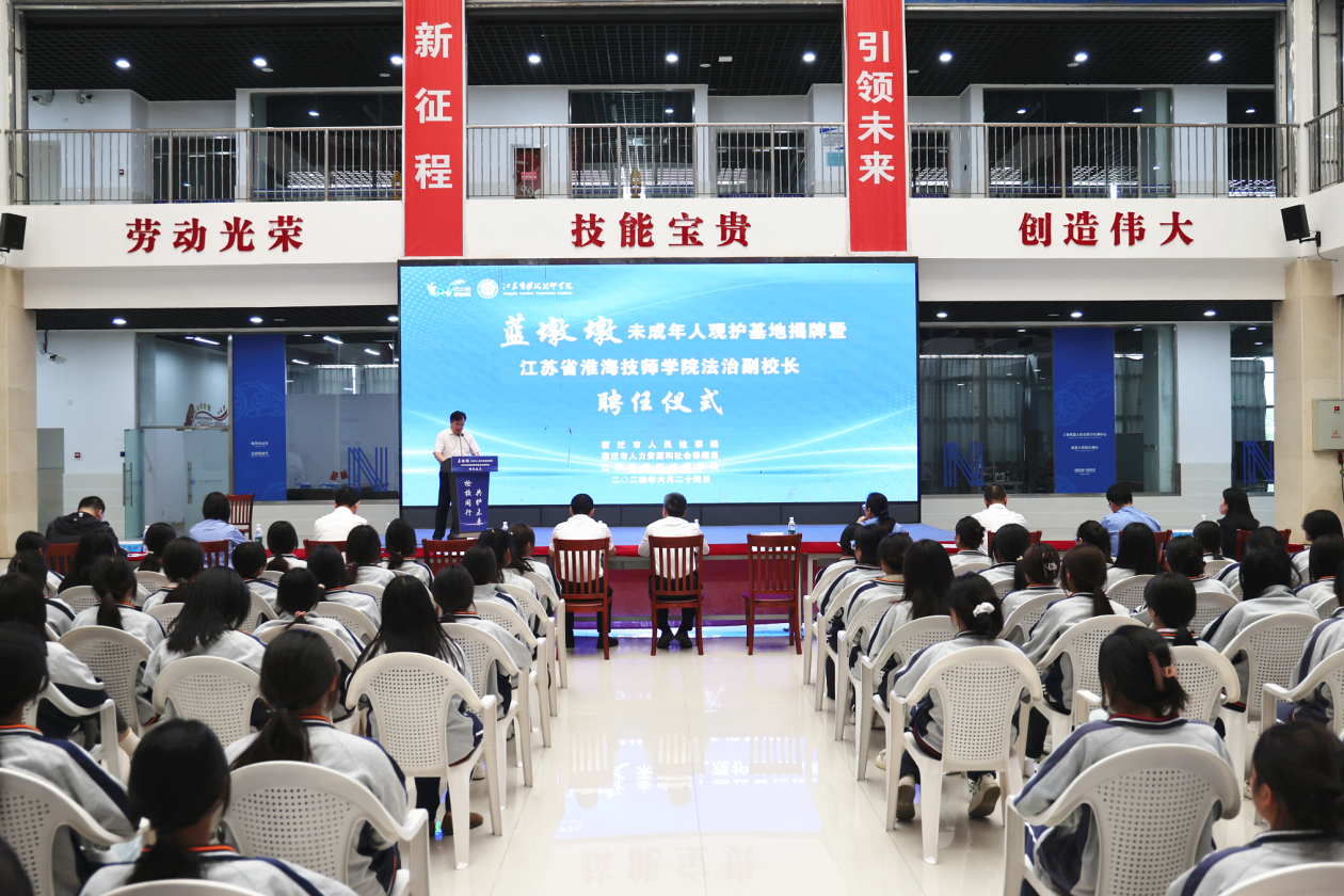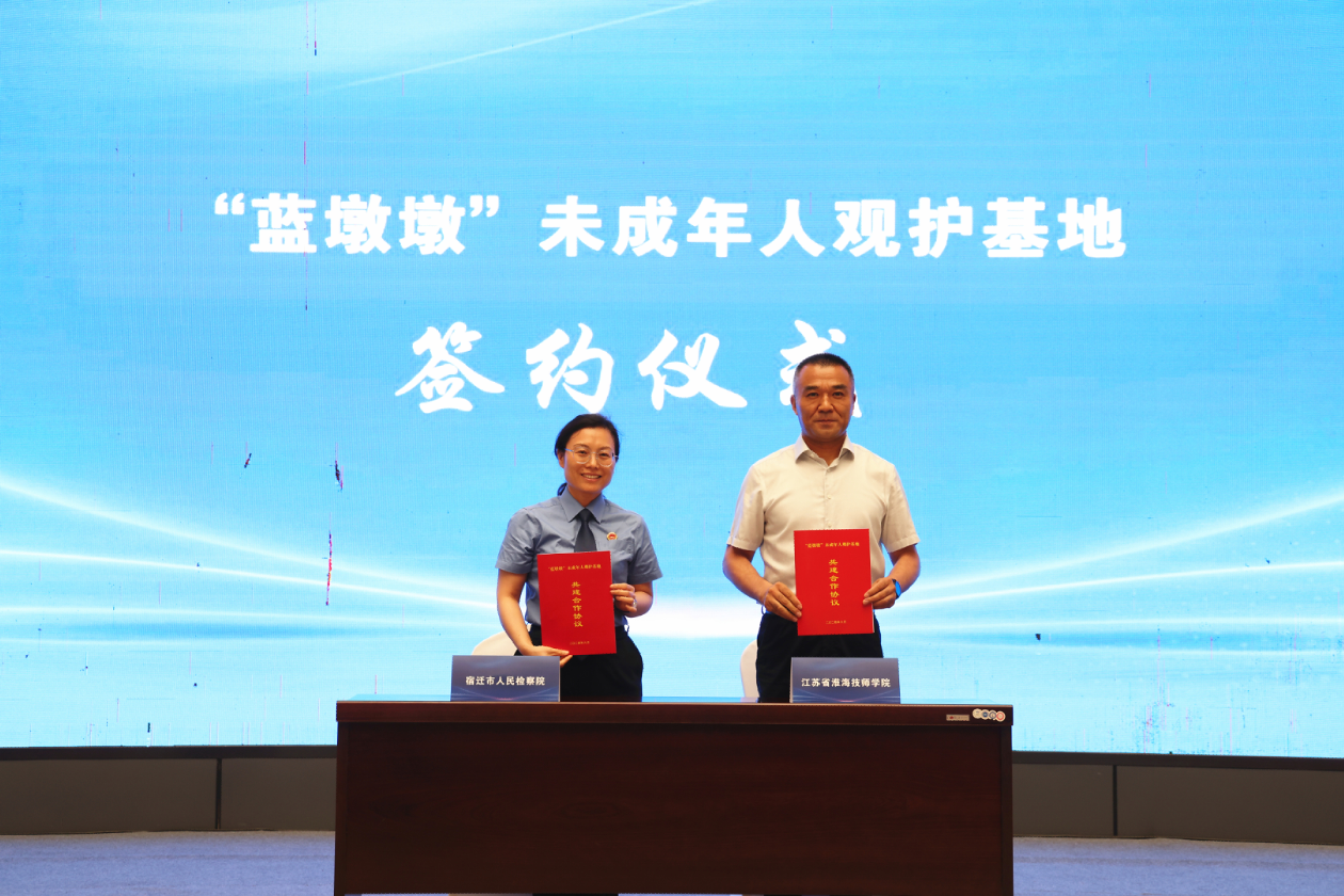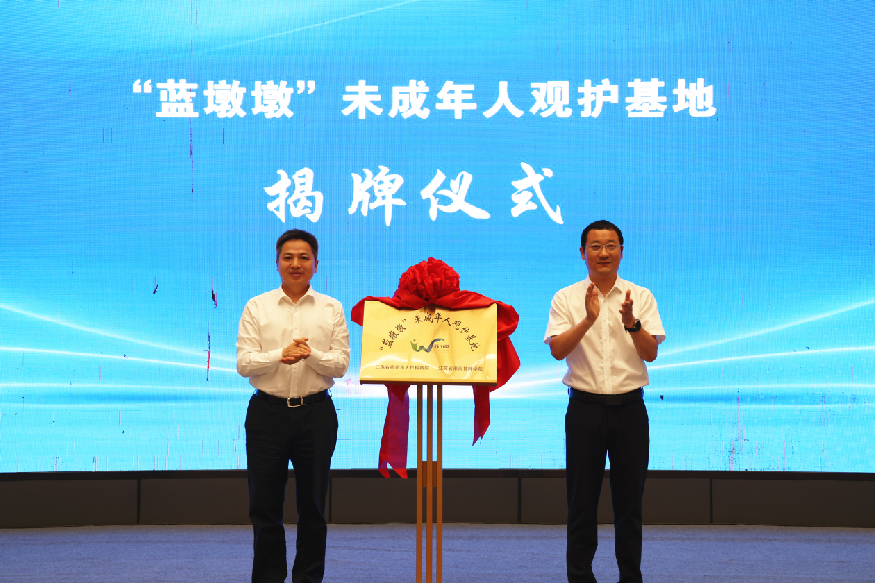 6月24日下午,我院与宿迁市人民检察院签订“蓝墩墩”未成年人观护基地共建合作协议,全市首个“蓝墩墩”未成年人观护基地揭牌成立。市政府副市长仲小兵,市人民检察院党组书记、检察长张登高,市政府副秘书长王磊,市人社局党组书记、局长钱信松,市人民检察院党组成员、副检察长赵静,学院党委书记李军、院长朱宇亮等出席活动。