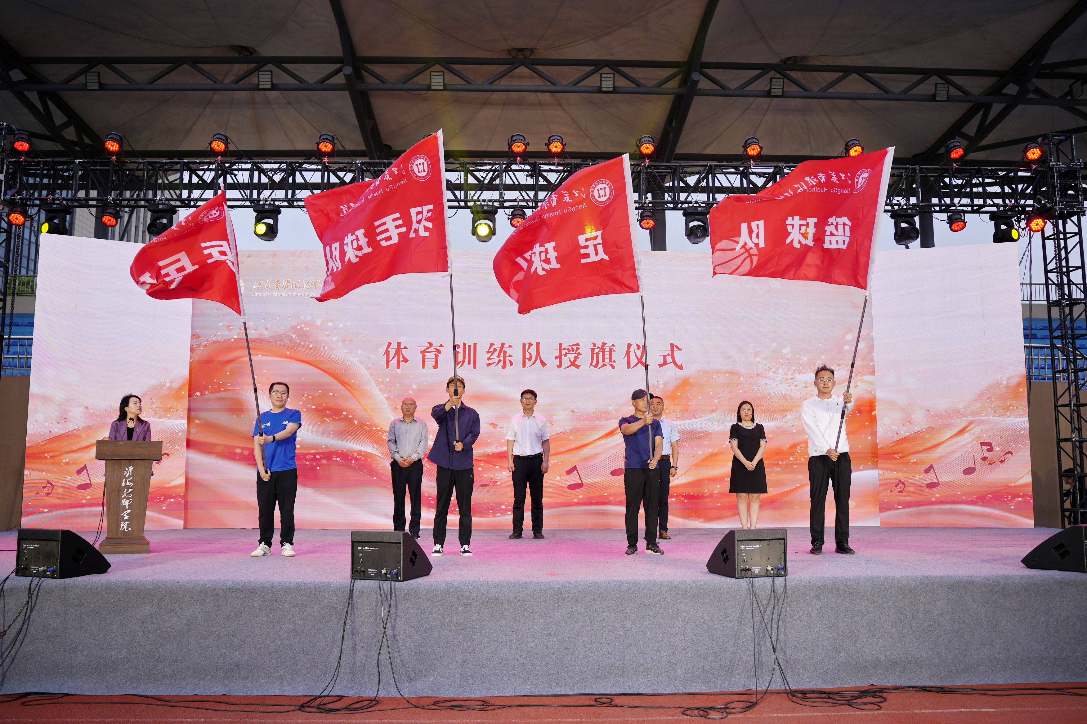 朱宇亮为篮球、足球、乒乓球、羽毛球等院级体育训练队进行授旗,激励学生运动员们发扬体育精神。各训练队教练员昂首挺胸,上台接过象征着荣誉与责任的旗帜。