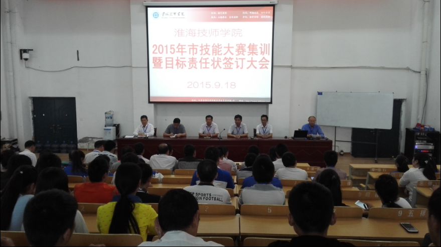 9月18日下午4:00,淮海技师学院在第三阶梯教室举行了2015年市级技能大赛暨目标责任状签订大会。这是一次激情动员大会,也是一次大赛前的誓师大会。