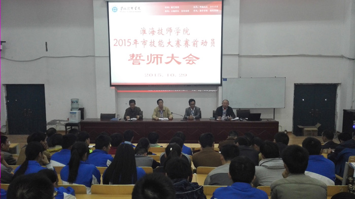 10月29日,淮海技师学院召开2015年市技能大赛誓师大会,院领导、会务工作人员、相关处室工作人员、参赛选手和指导教师参加了会议。