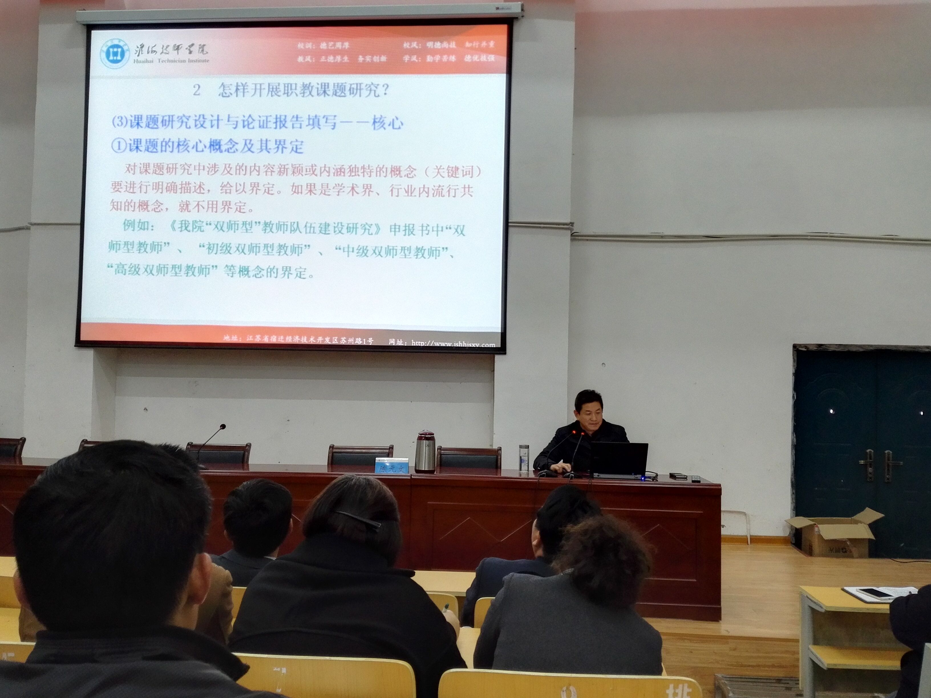 11月17日下午,我院每周一次主题教研活动如期进行,本次教研活动的主题是“怎样开展职教课题研究”。由我院分管领导陈元文主讲的讲座。活动是采取集中形式,全体教师在第三阶梯教室听讲座。