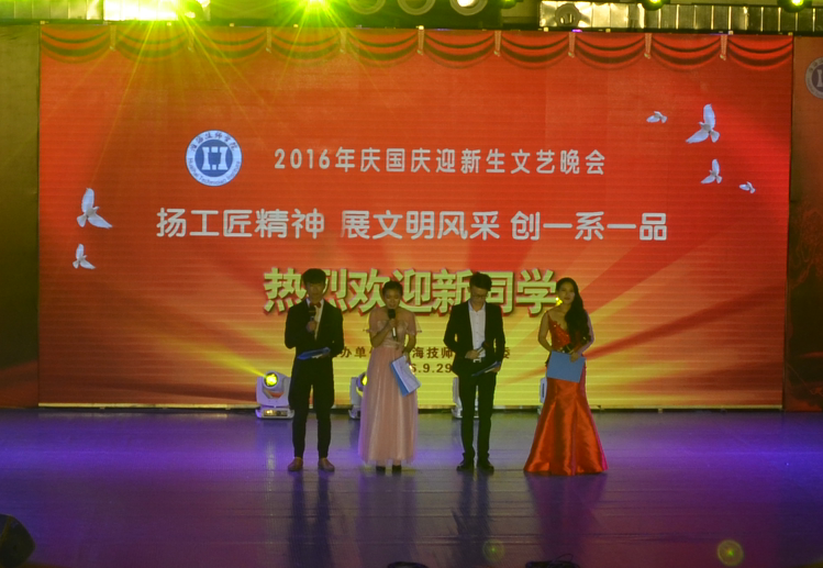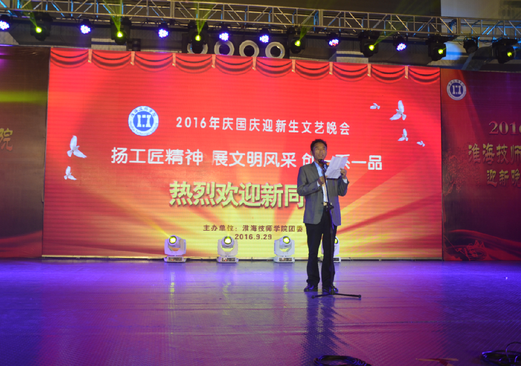 金风送爽迎新生,盛世欢歌庆华诞。9月29日晚,我院体育馆人头攒动,流光溢彩,歌舞欢腾,由院团委主办的“扬工匠精神,展文明风采,创一系一品——淮海技师学院2016年庆国庆迎新生文艺晚会”在这里隆重举行。学院党委委员、副院长张兵营、王治,院分管同志、各系负责人与全院师生欢聚一堂,共同观看了晚会。