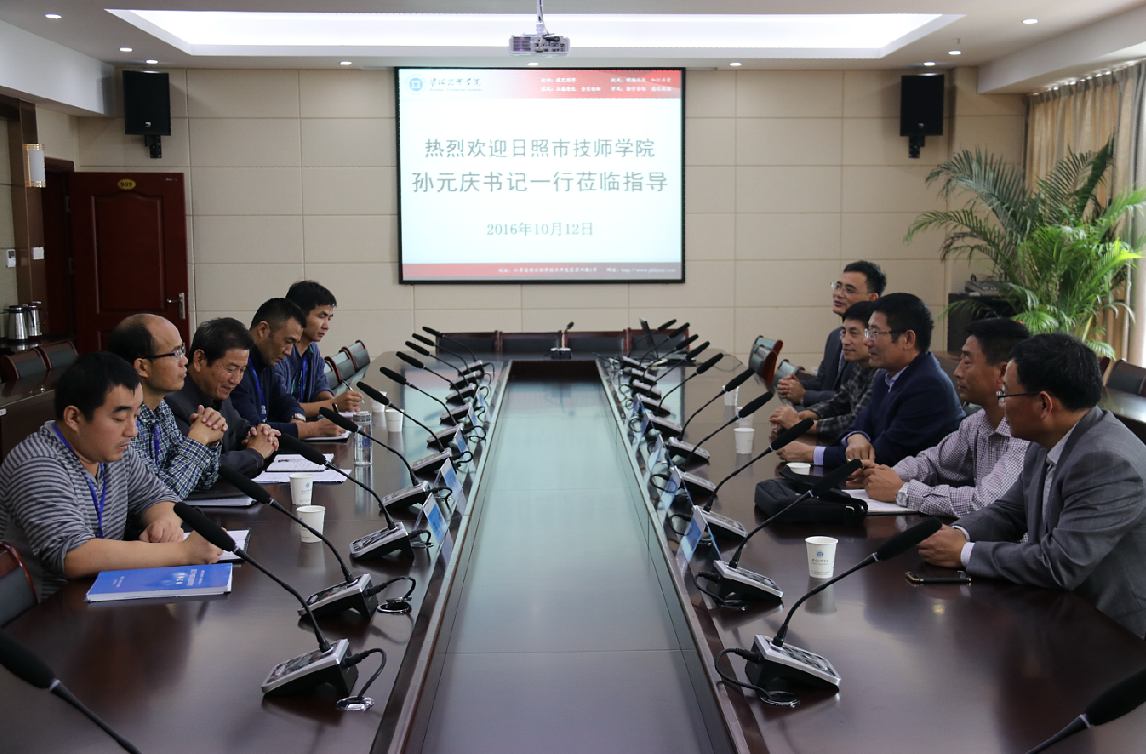 10月12日上午,日照市技师学院党委副书记孙元庆一行六人来我院就中德合作办学等相关工作进行考察交流。学院分管同志陈元文、党政办公室主任朱宇亮等在行知楼九楼会议室热情接待了来访客人。