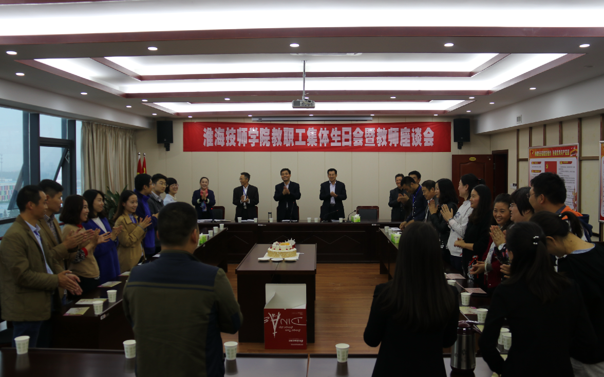 10月19日下午,淮海技师学院会议室欢声笑语,蛋糕飘香。2016年秋季第一次集体生日会暨青年教师座谈会在这里举行,院领导、工会全体委员及农历九月生日的教师参加了会议,会议由院工会负责人吴良利主持。
