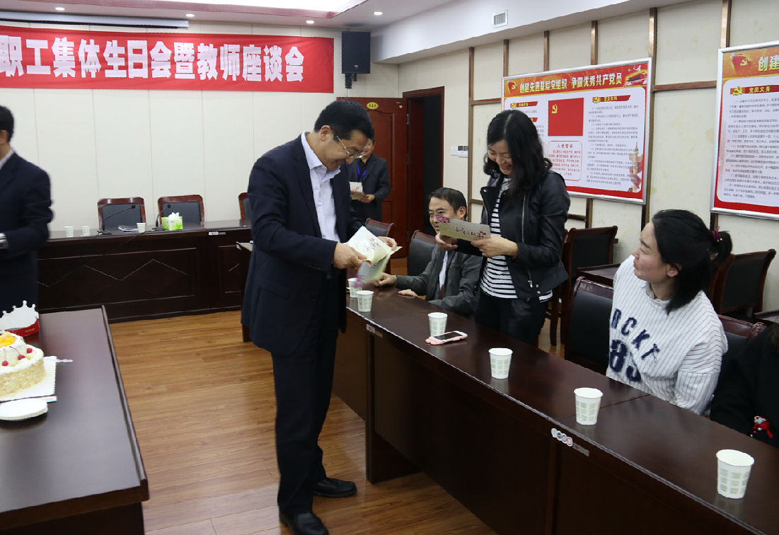 会上,院领导、工会委员分别向生日的教师送上自制的生日贺卡和美好的祝福。“寿星”们共唱生日歌、共切生日蛋糕、共叙人生感悟,共同感受着淮海技师学院这个大家庭带来的温暖和感动,现场处处洋溢着喜庆、欢乐、幸福的气氛。