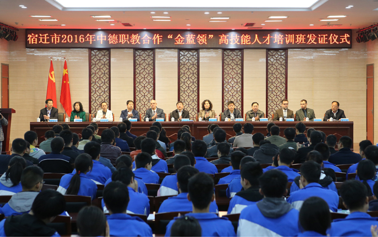 伴随着宿迁的资格资质去行政化改革的深化,我市于2015年开始正式启动与德国埃尔福特教育培训中心、德国工商业行会和德国手工业协会的合作,围绕着技能人才的培养,共开展了五个合作项目。一是实施“金蓝领”高技能人才培养;二是成立运作“中德职业技能培训鉴定中心”;三是开展中德国际合作办学;四是组织赴德师资培训;五是借鉴学习德国职业教育办学经验。“金蓝领”高技能人才培训合作是其中重中之重的内容。