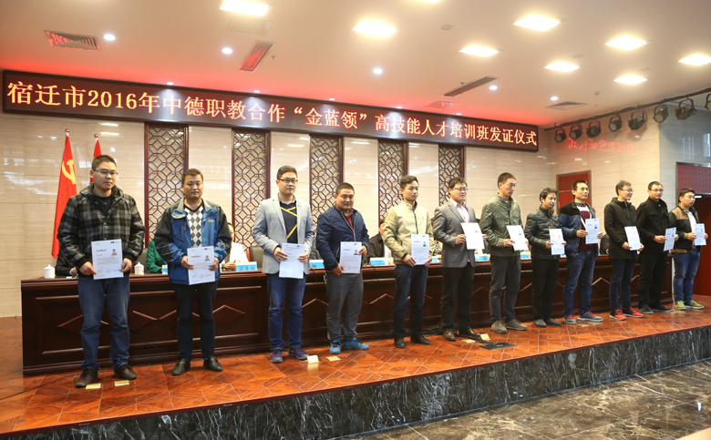 据悉,首期“金蓝领”高技能人才培训班参加培训人数共50人,主要是来自市内重点企业的技术骨干、宿迁地方优秀的管理人才和全市职技院校的优秀师生。围绕产业转型升级和经济发展紧缺性人才需求,首期“金蓝领”高技能人才培训班培训项目为数控技术和维修电工两个专业,全部严格按照德国工商业行会(IHK)的模块化培训标准进行培训,培训教师都是来自德国相关领域的专家。高质量的教学,结出了丰硕的优质果实,首期“金蓝领”高技能人才培训班学员的培训考试通过获证率超过88%,43人拿到了德国工商业行会(IHK)证书。