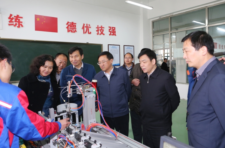 张兵营向朱厅长一行详细介绍了学院近年来软硬件建设情况,汇报了我院师生在各类大赛上所取得的成绩。朱厅长充分肯定了学院技能人才培养工作所取得的成效,对学院的办学业绩和国家示范校建设成果给予高度评价。随后,朱厅长视察了校园,参观了社会化培训中心、网络创业培训中心、工业机器人实训中心、机械加工实训中心、数控加工实训中心、财会实训中心及汽车检测与维修实训中心等,听取了学院国家发改委职业教育产教融合项目基地的规划建设情况汇报。朱厅长对学院下一步发展给予了指导性意见,他强调,学院要坚持应用型技能人才培养的路子,充分发挥自身优势,重点打造特色品牌,深度挖掘办学潜力。在起到示范引领作用的同时,要与兄弟院校互帮互助,共同发展提高,推动我省技工教育及职业教育的整体发展。
