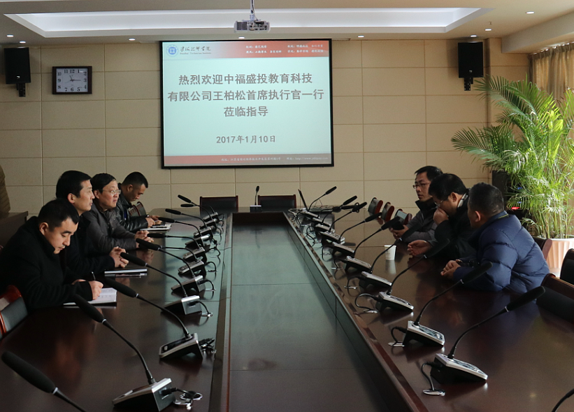 1月10日上午,中福盛投教育科技有限公司首席执行官王柏松一行3人在市教育局职社处处长毕进的陪同下到我院考察,并就合作办学事宜与学院进行座谈交流。学院党委委员、副院长张兵营及相关部门负责人热情接待了王总一行。