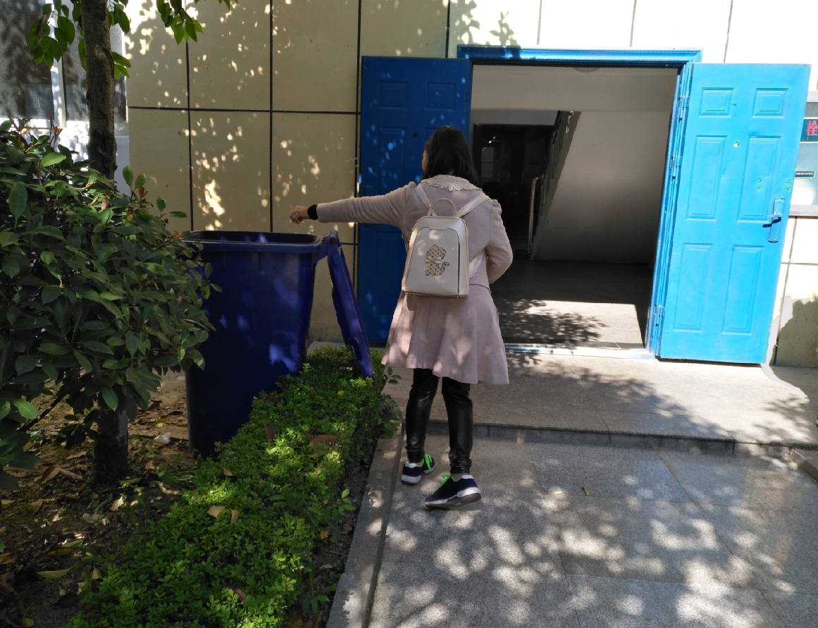 巧的是,在今早的2017学年第十次升旗仪式上,学院教职工全部在“保护校园环境”的横幅上签名,争做文明卫士。而这样的事件比签名仪式鲜活得多,于是我们打算对这件事广为宣传、树立典型。当我们要为她拍照的时候,她几次羞赧地遮挡脸庞,不想上镜,怕被别人认为是作秀,最后只留给我们一个背影。她开玩笑地说:“老师请别拍我,我怕被老同学认为是专职捡垃圾的了。”