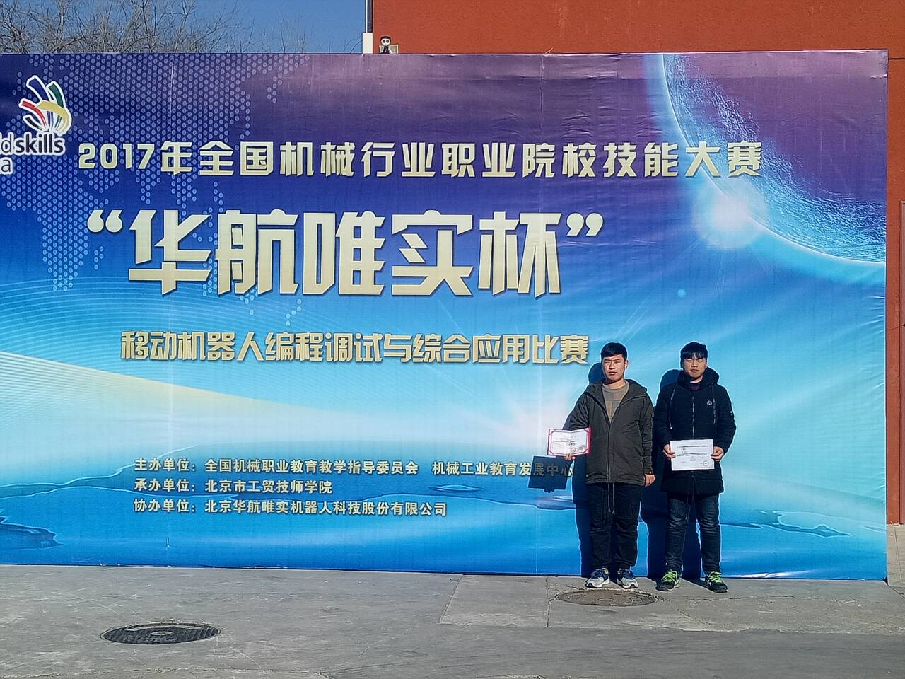 12月9日,全国机械行业职业院校技能大赛——“华航唯实杯”智能制造应用技术技能大赛“移动机器人编程调试与综合应用”赛项在北京工贸技师学院举行。我院机电工程系学生沈昊、朱木代表学院参加比赛,经过激烈角逐,最终获得铜牌。