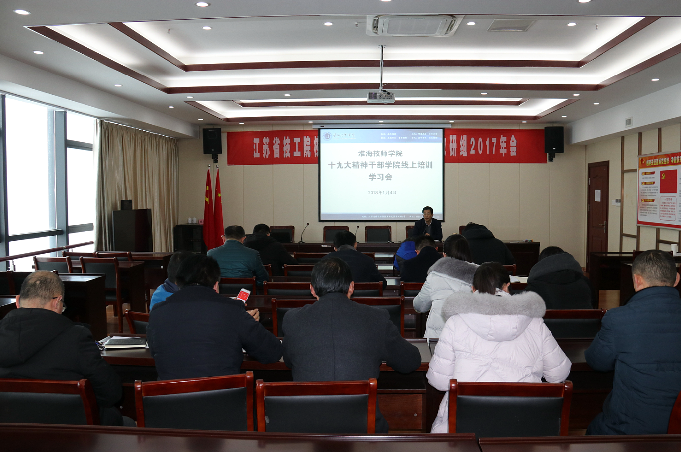 1日4日下午,机关党支部在行知楼九楼党员活动室召开十九大精神干部学院线上培训学习会。学院党委副书记、副院长张兵营出席学习会并讲话。机关党支部全体党员参加了学习会。