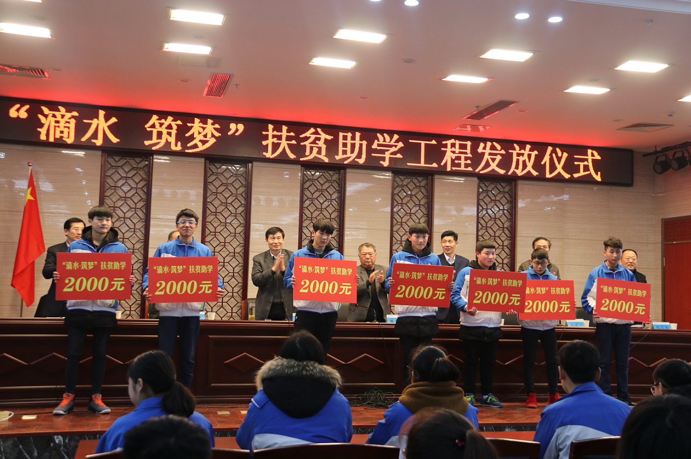 张兵营介绍了近年来学院发展情况,并就资助工作作了介绍。学院于2017年8月被江苏省老区开发促进会、江苏省扶贫基金会、江苏省扶贫开发协会确定为人才培训基地,现有“滴水筑梦”扶贫助学金扶持贫困学生读书项目,本次共计资助100名学生,每名学生每年2000元,资助3年。他强调,为充分发挥助学金的作用,学院一是加强助学金的规范审核,公开申报、公开发放;二是加大“滴水筑梦”助学活动的宣传,扩大助学活动的影响;三是加强学生感恩教育,充分利用助学活动,让学生体会社会的关爱,知道感恩。