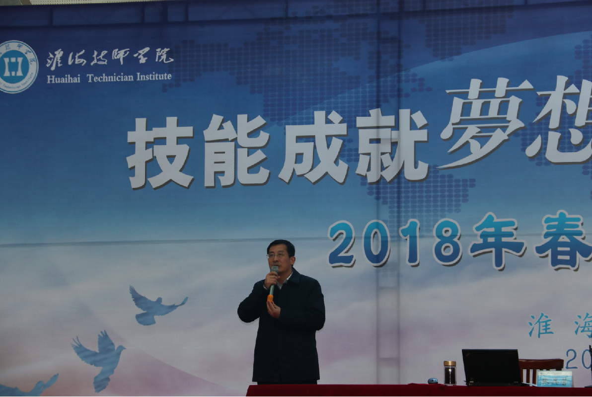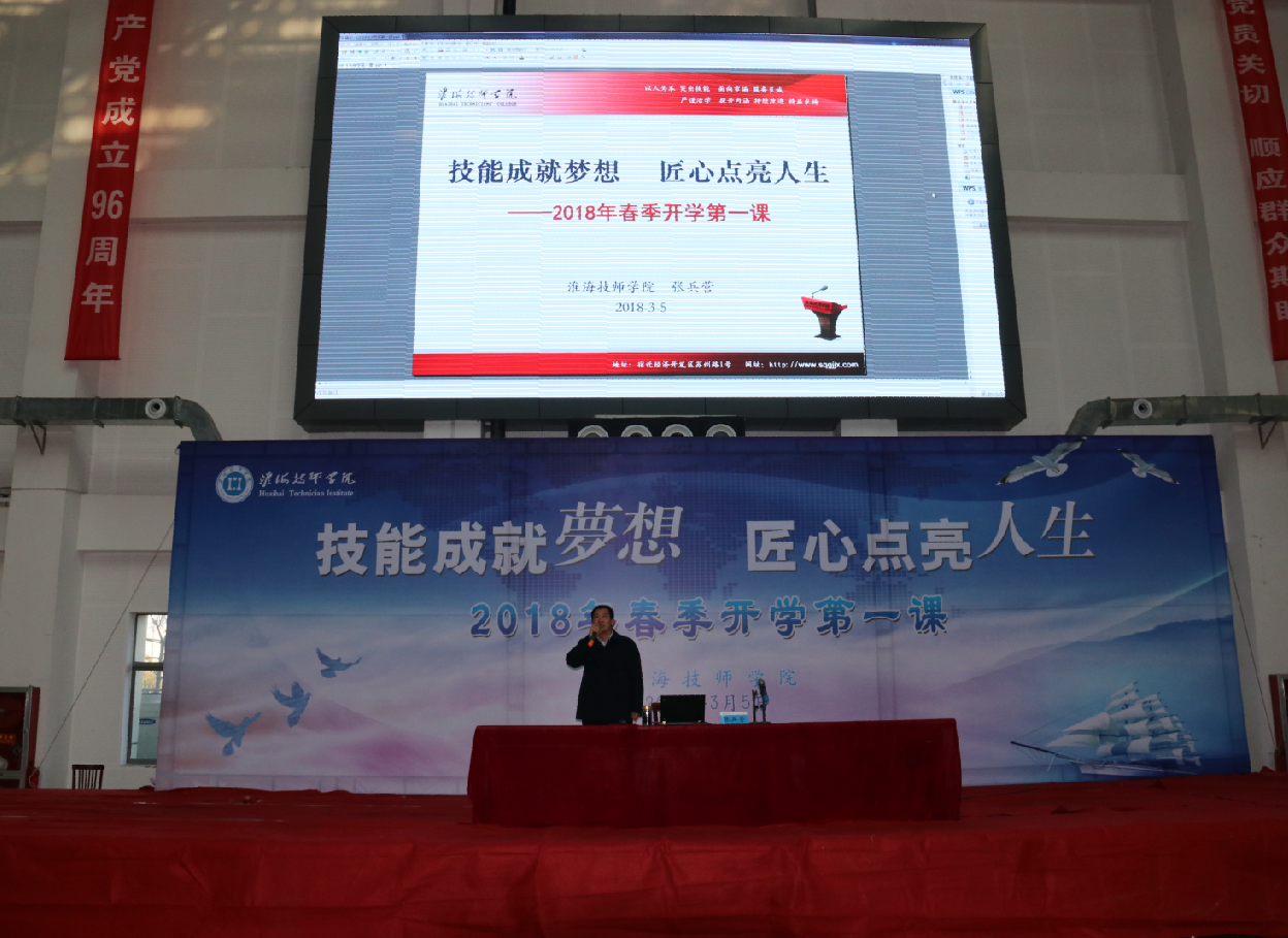 3月5日下午,淮海技师学院在体育馆隆重举行2018年春季“开学第一课”活动。院领导、全体师生参加活动。张兵营院长亲自为全院师生讲授新学期“开学第一课”。