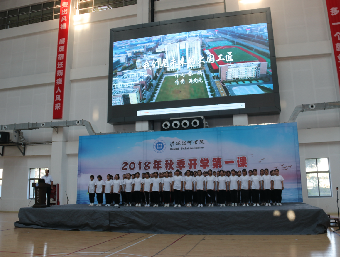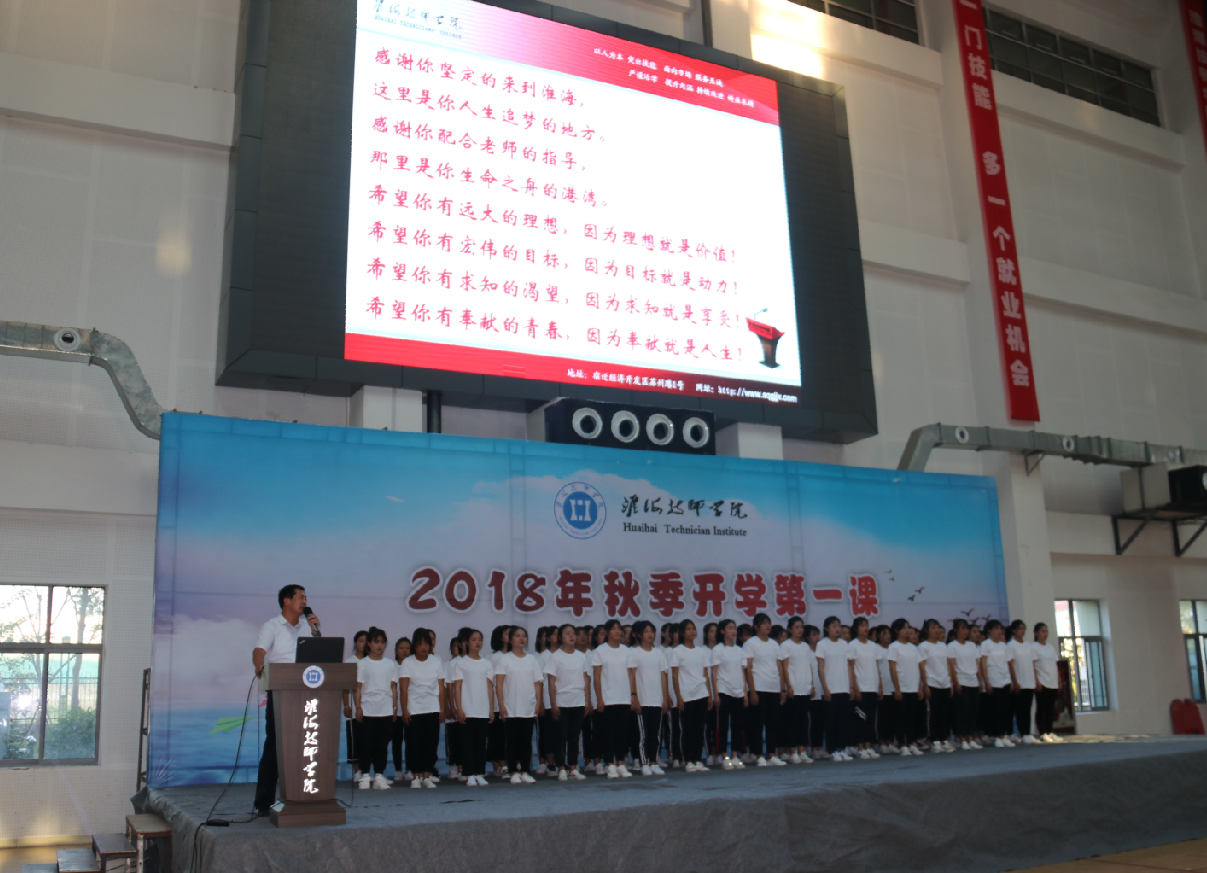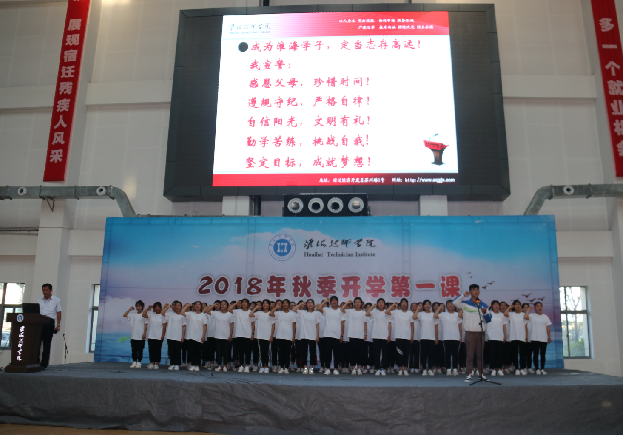 “成为淮海学子,定当志存高远!我宣誓:感恩父母,珍惜时间!遵规守纪,严格自律!自信阳光,文明有礼!勤学苦练,挑战自我!坚定目标,成就梦想!”在激昂的旋律中,同学们集体宣誓,坚定有力的宣誓声回荡在体育馆中,震人发聩,久久不息!