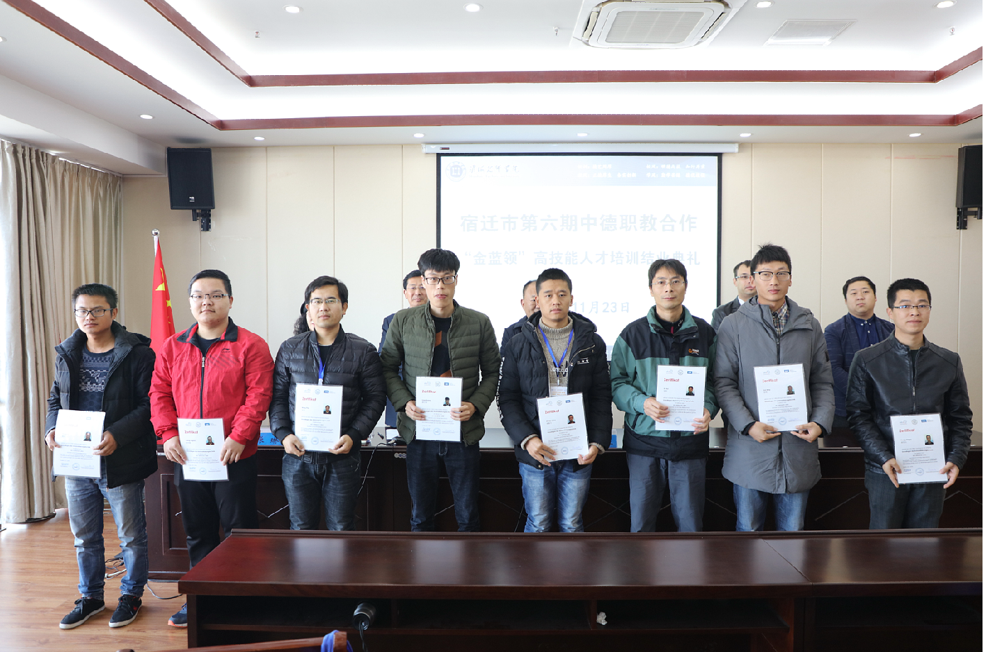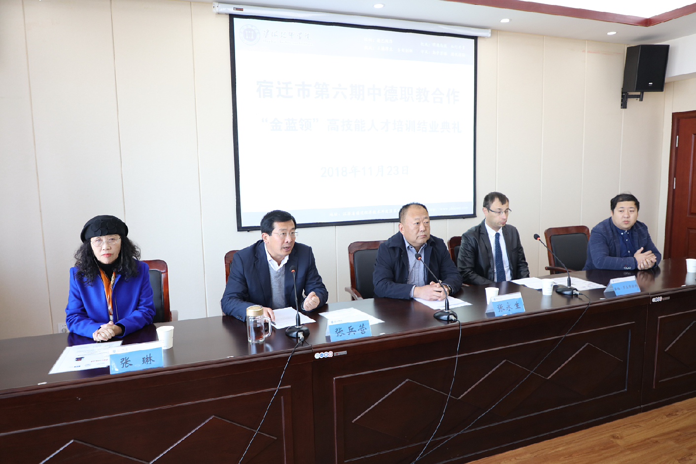 11月23日上午,宿迁市第六期中德职教合作“金蓝领”高技能人才培训班发证仪式在我院举行。宿迁市人社局党组成员、市考试鉴定中心主任张永生,德国埃尔福特教育培训中心机电一体化高级讲师英格·罗森布拉特,雅堂德中教育投资咨询有限公司董事长张琳出席发证仪式。仪式由我院党委副书记、副院长张兵营主持。